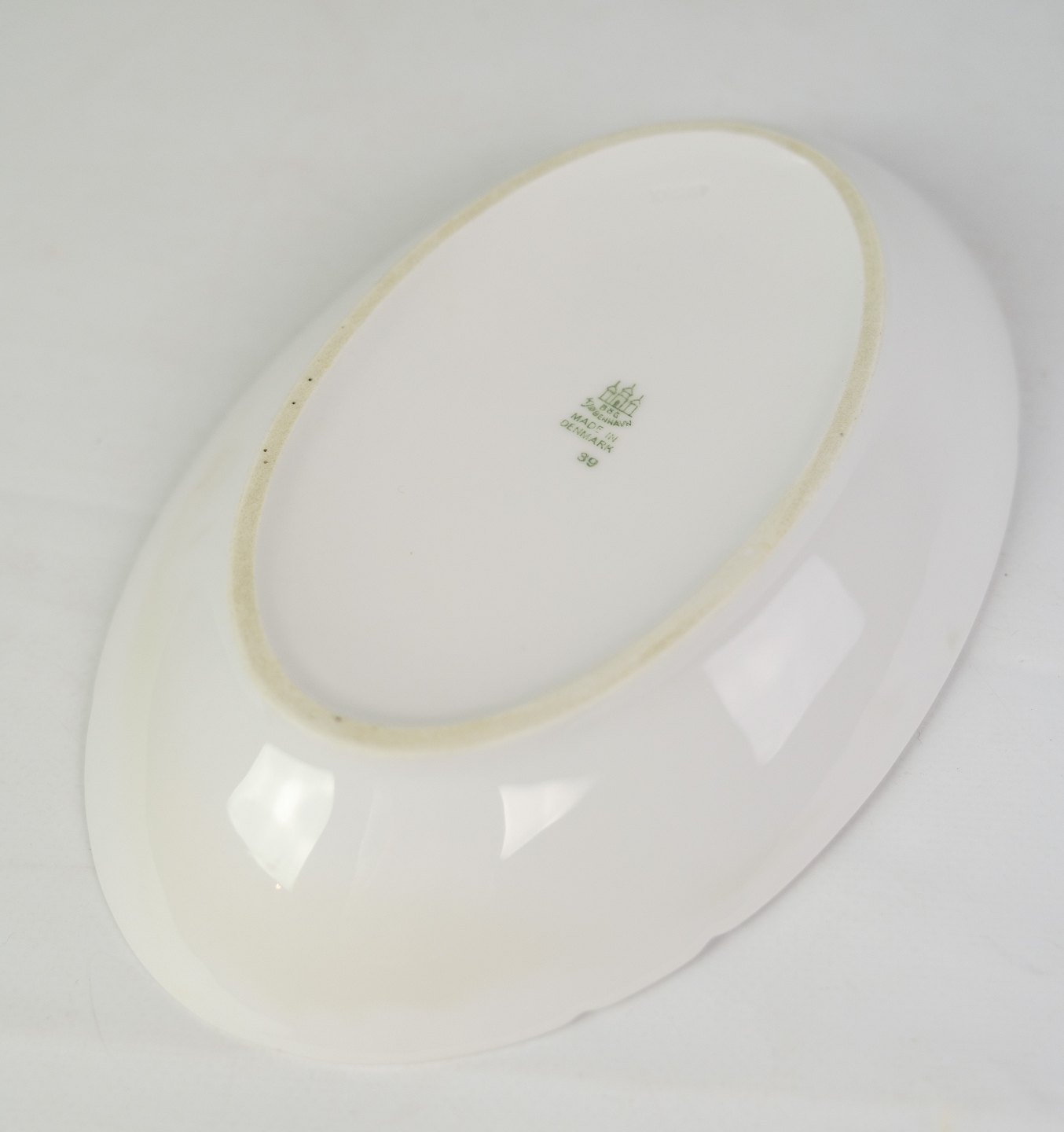 Hvid riflet ovalt fad fra Bing & Grøndahl fra omkring år 1950'erne.