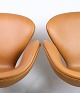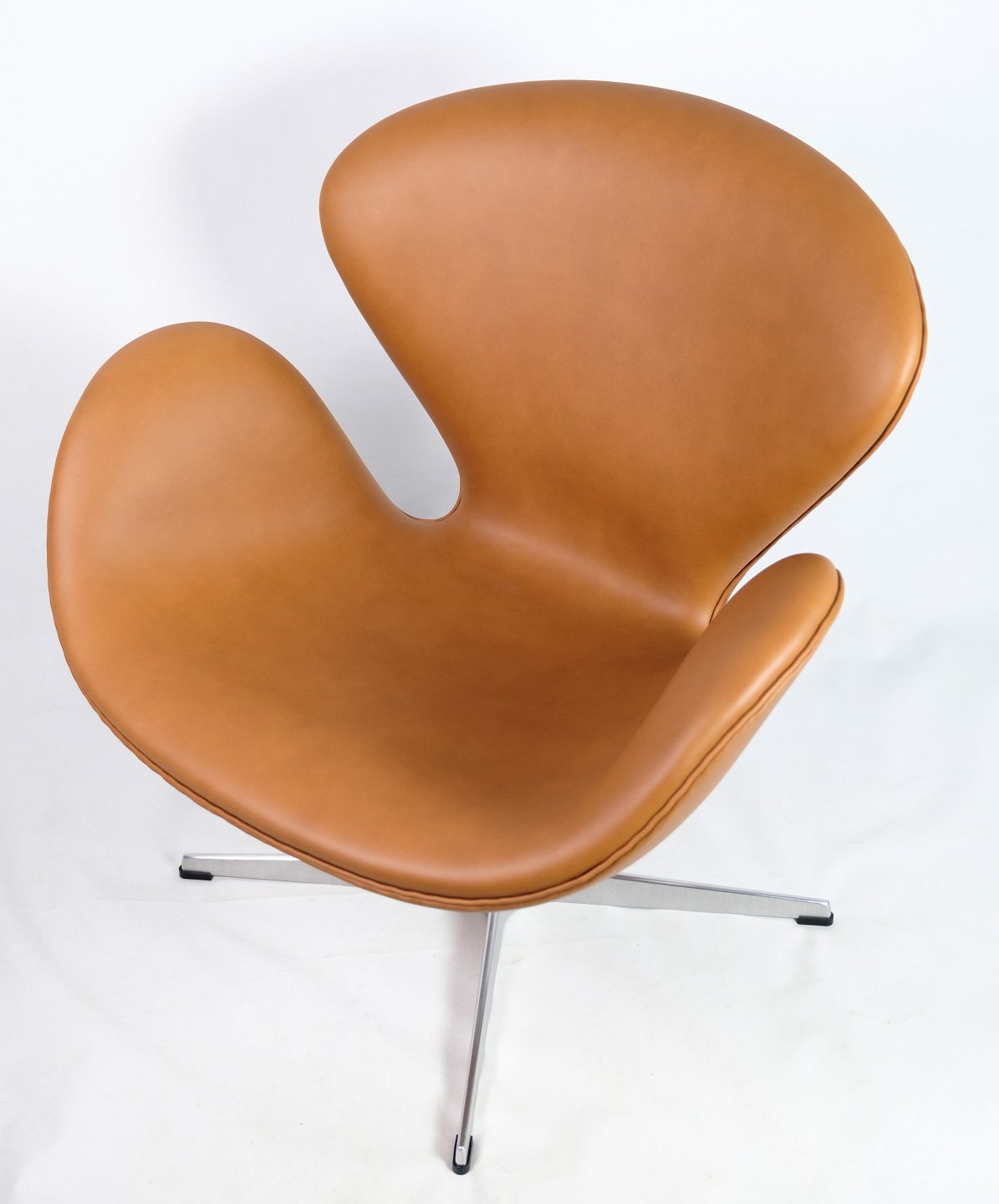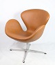 Svanen, model 3320, designet af Arne Jacobsen fremstillet hos Fritz Hansen og formgivet i 1957-1958. Lænestolen står med originalt læder af den højeste kvalitet og i fremragende stand. Stolen er drejelig, med føder af aluminium.