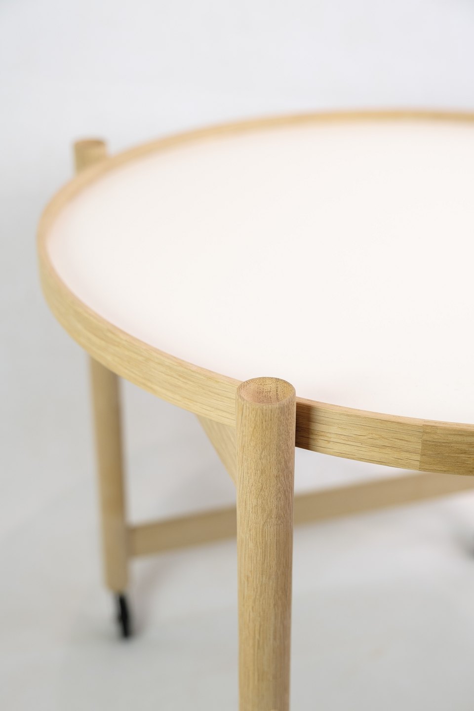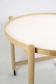 SolgtBakkebord, designet af Hans Bølling af træsorten egetræ med bakke af hvid laminat.