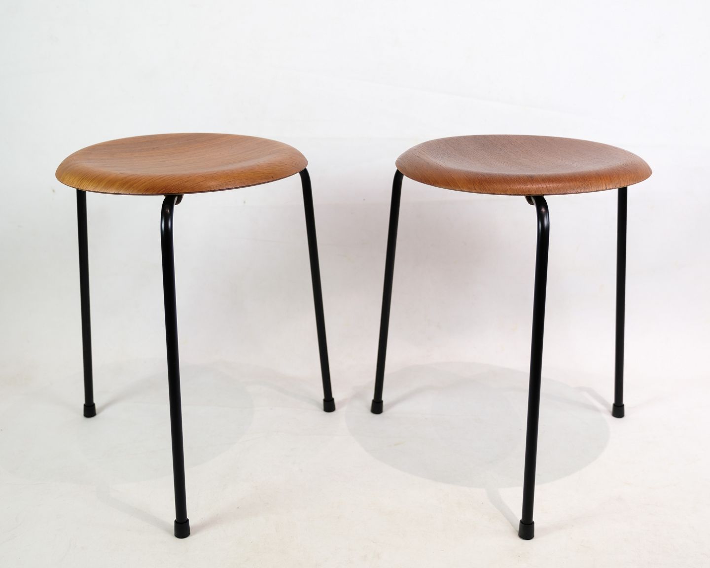 SolgtEt sæt skamler af træsorten teaktræ med sort stel, designet af Arne Jacobsen og fremstillet af Fritz Hansen fra omkring 1950'erne.