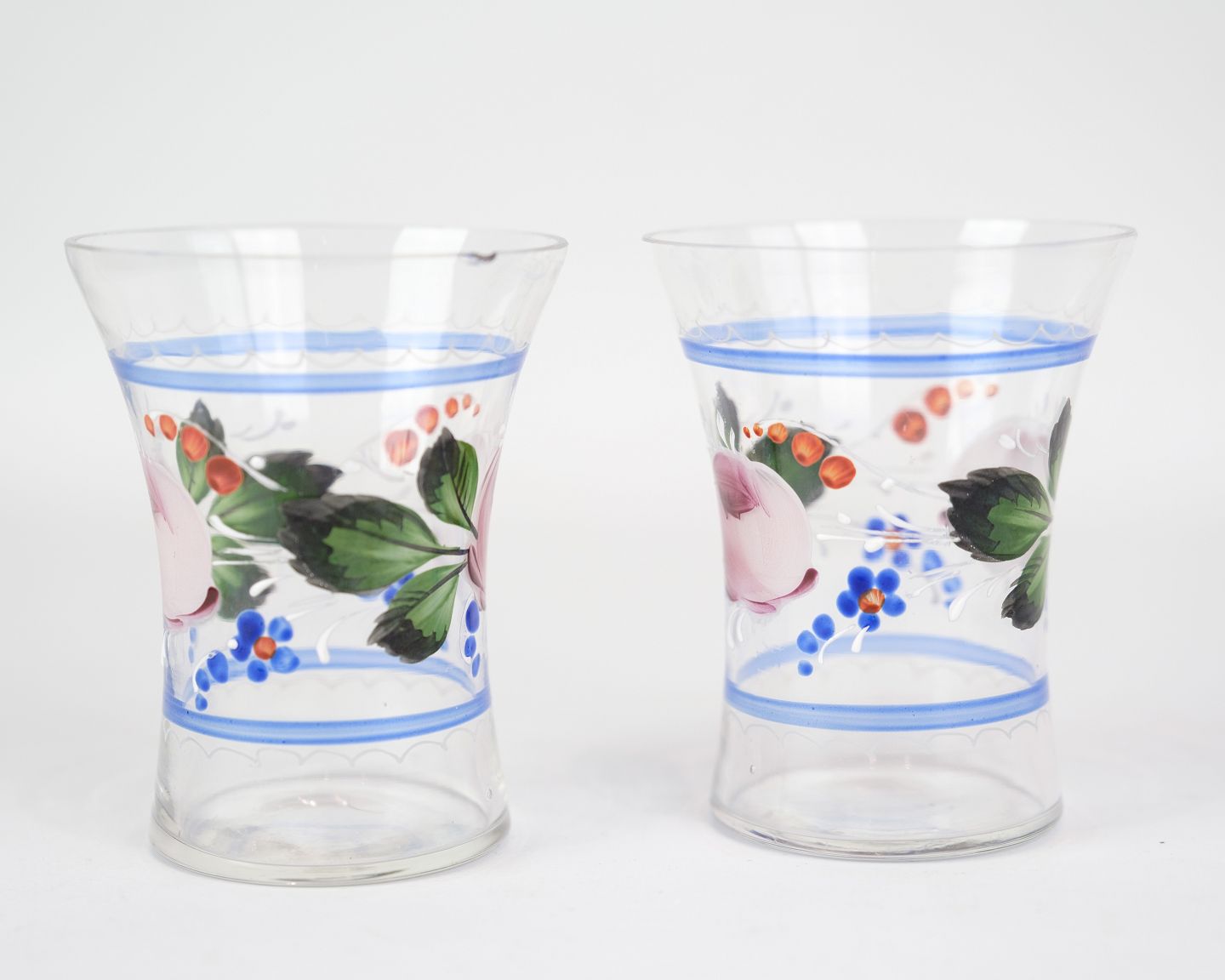 A pair of glass vases with hand-painted floral decoration from around the 1930s.
