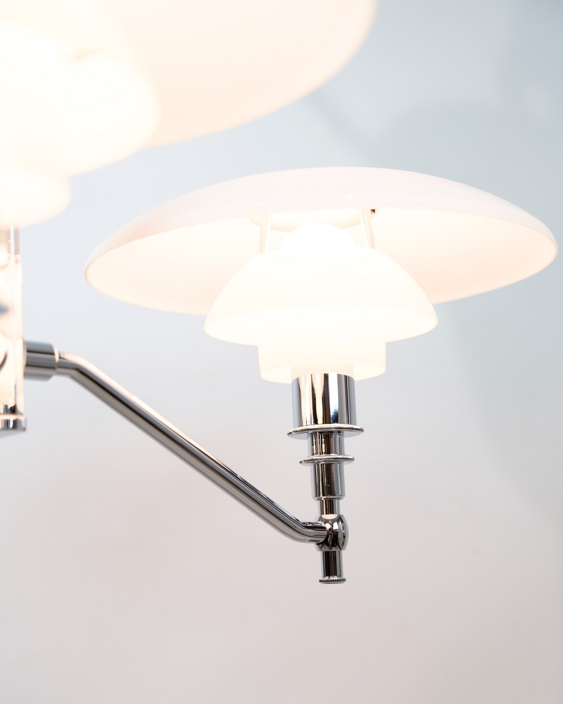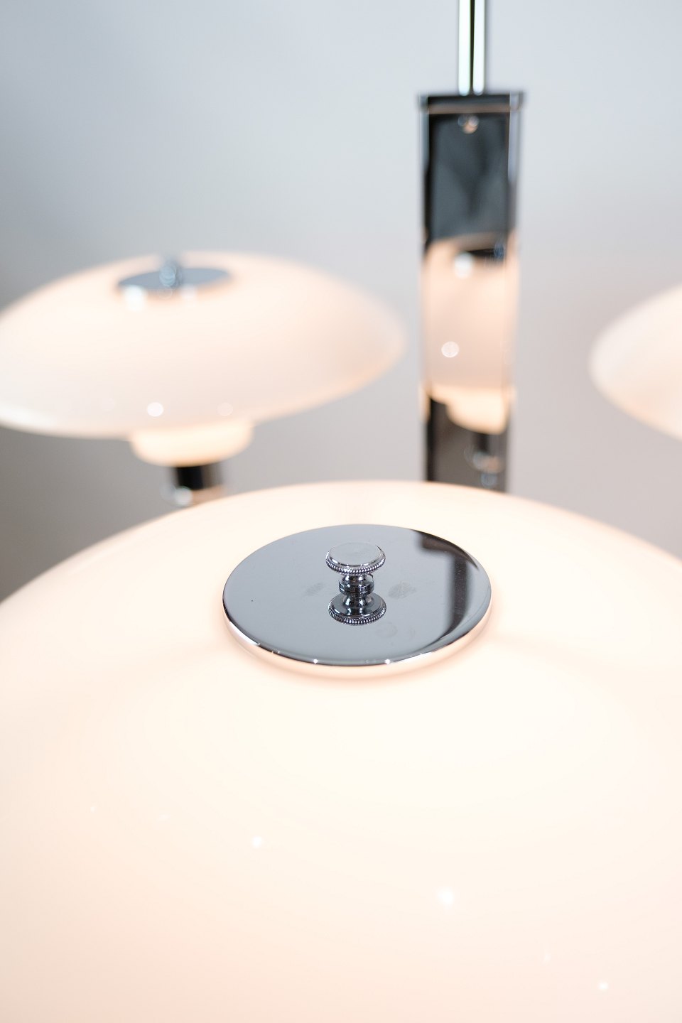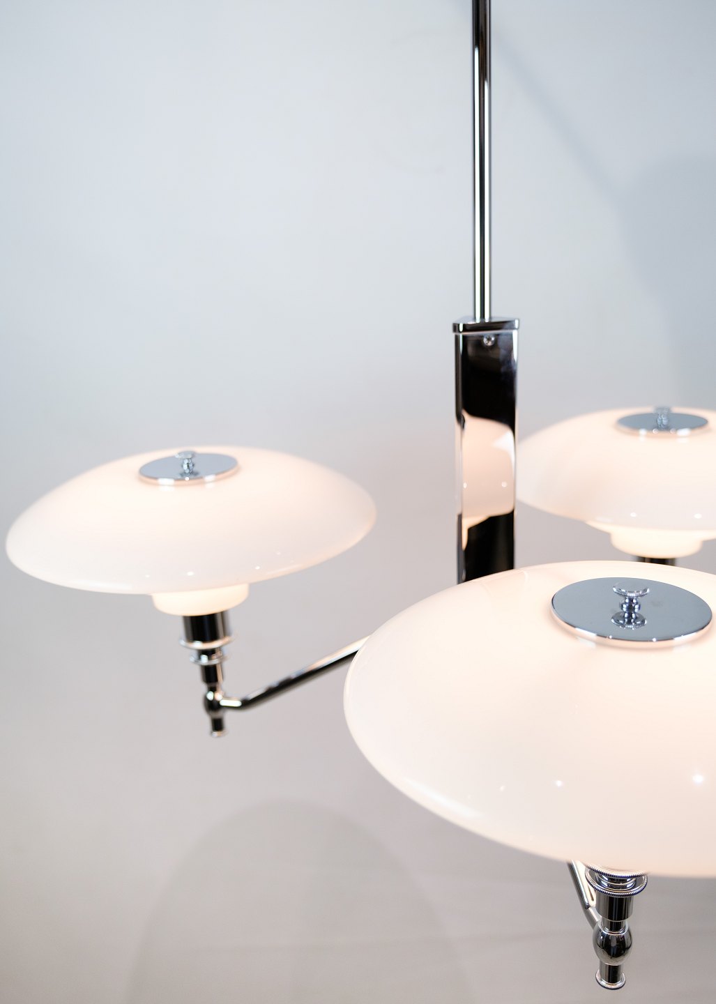 SoldPH 3/2 Academy crown designed by Poul Henningsen in 1925-1926, launched in 2000 and manufactured by Louis Poulsen. The crown is made of hand-blown white opal glass and high-gloss chrome-plated.