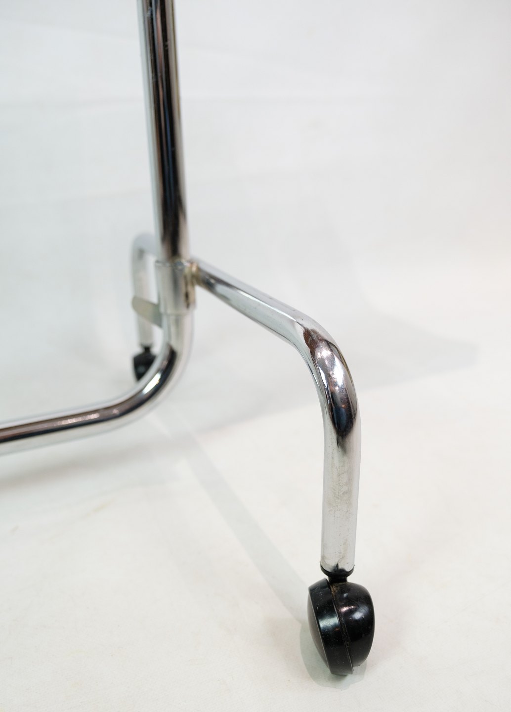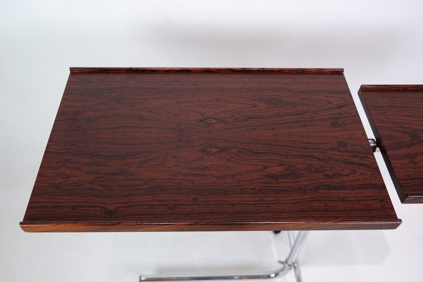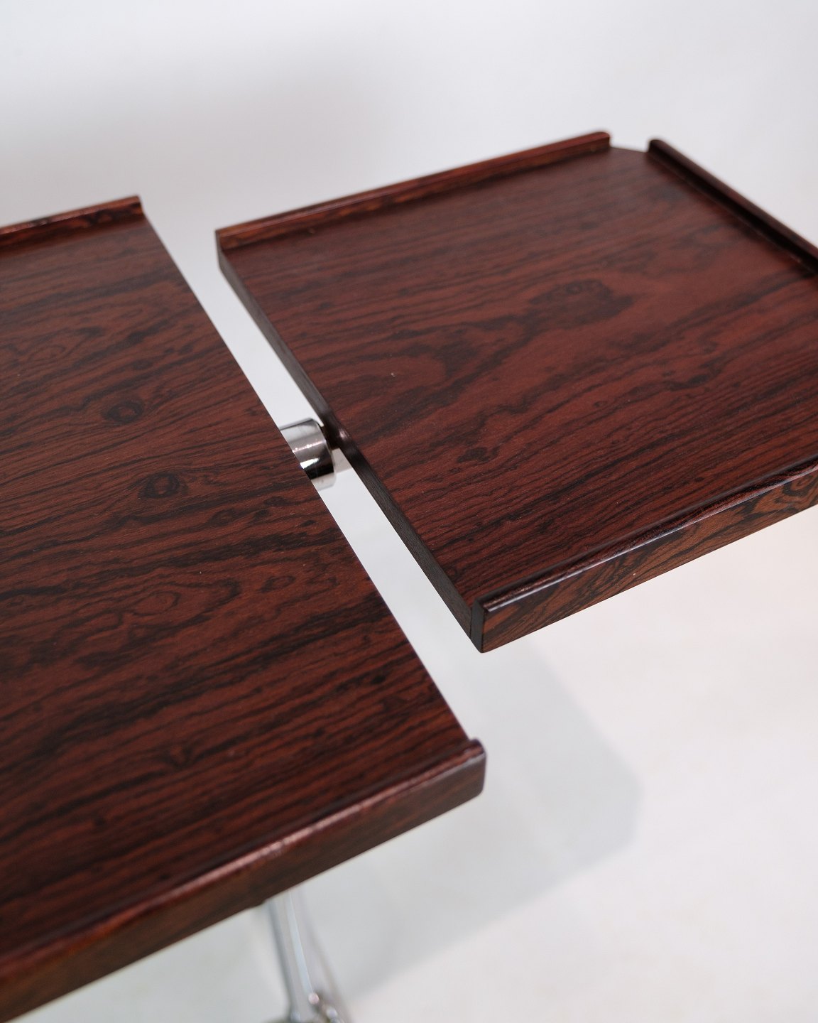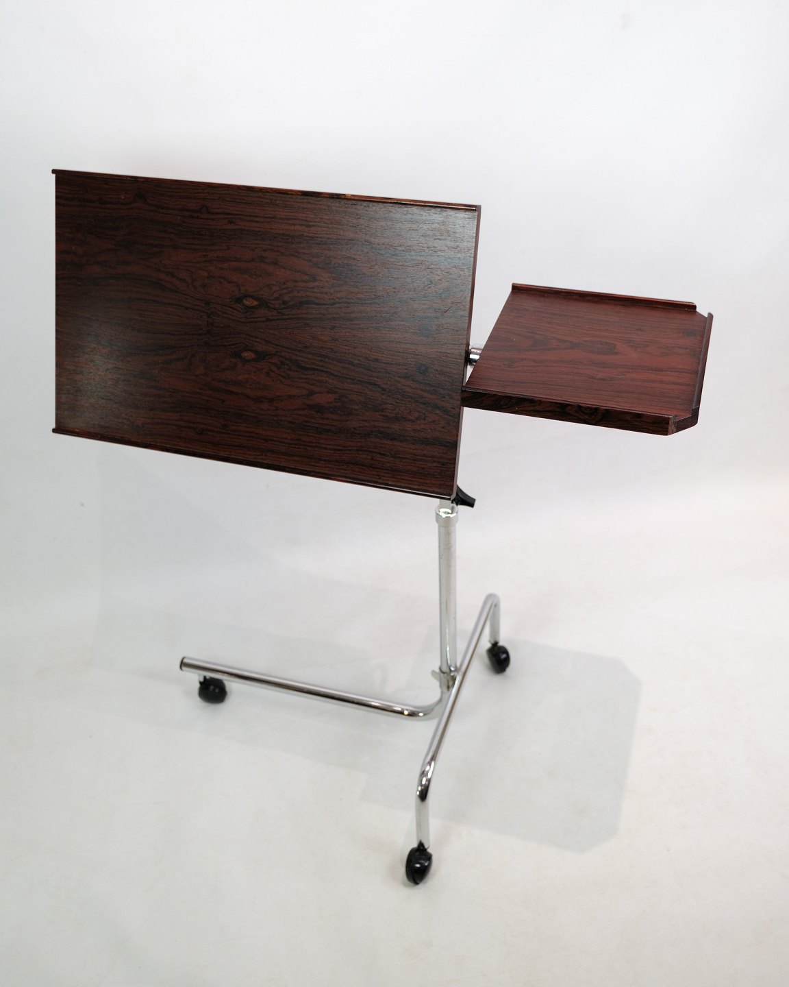Justerbart sideboard i træsorten palisander med poleret stel af krom af dansk design fra omkring 1960'erne. Vil lave et flot sengebord, endebord, tv-bord eller arbejdsbord. Lille sidebord er aftageligt. Sidder på hjul for nem flytning.
