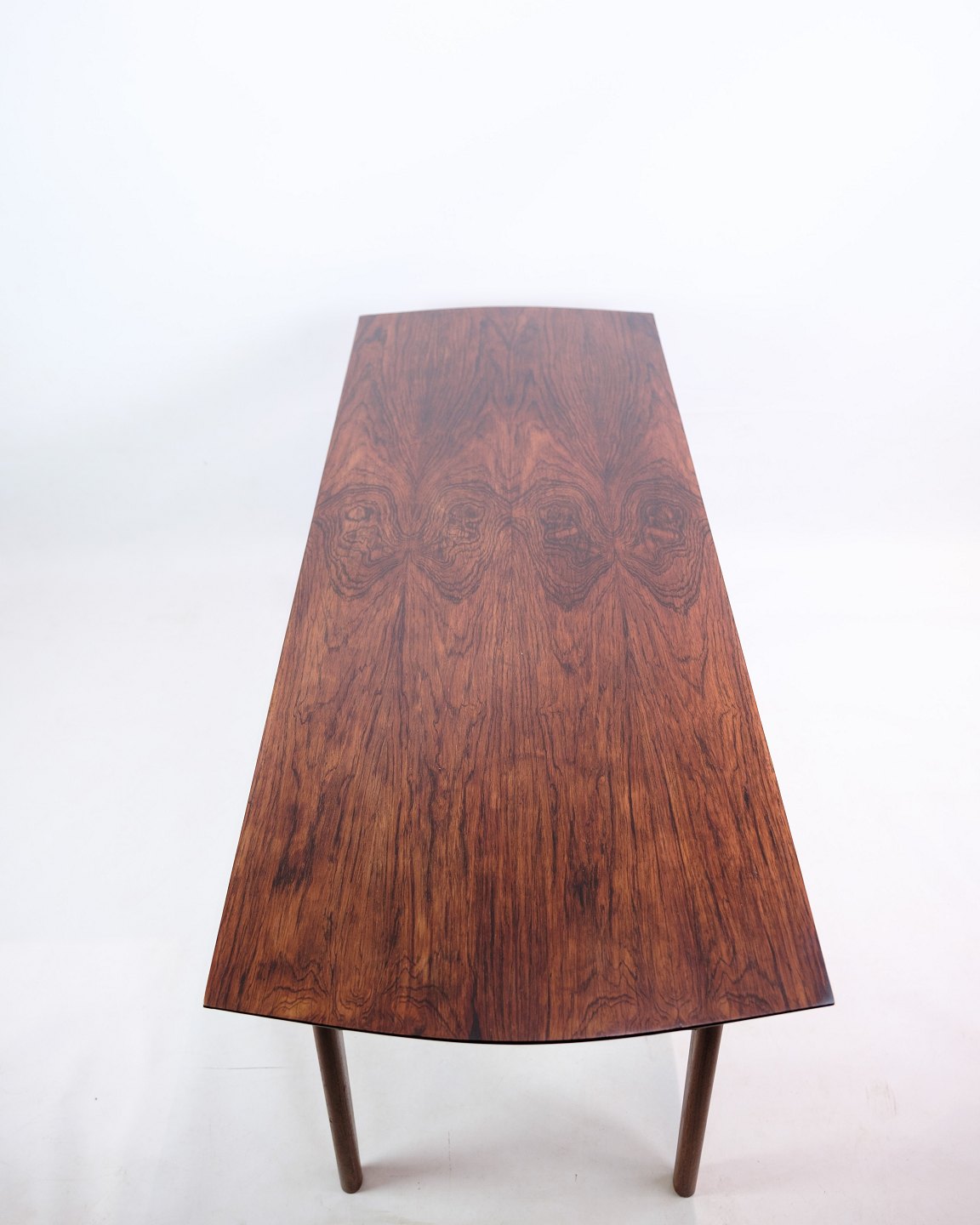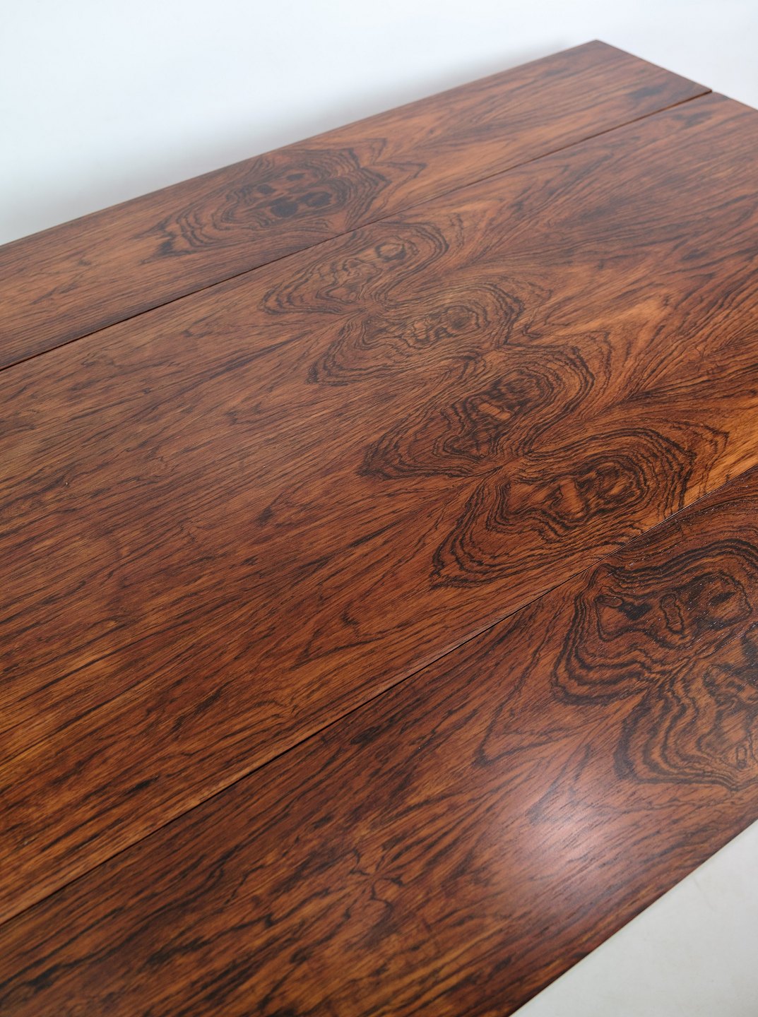 SolgtSofabord i palisander af Heltborg Møbler Danmark med underliggende flethylde fra omkring 1960'erne. Sofabordet har også udtræksplader i hver side, som gør det henholdsvis 47 cm og 87 cm bredt.