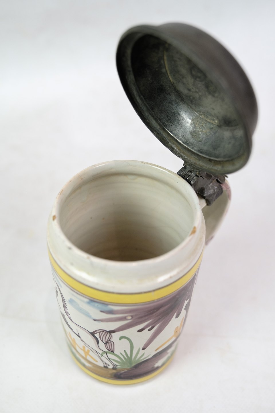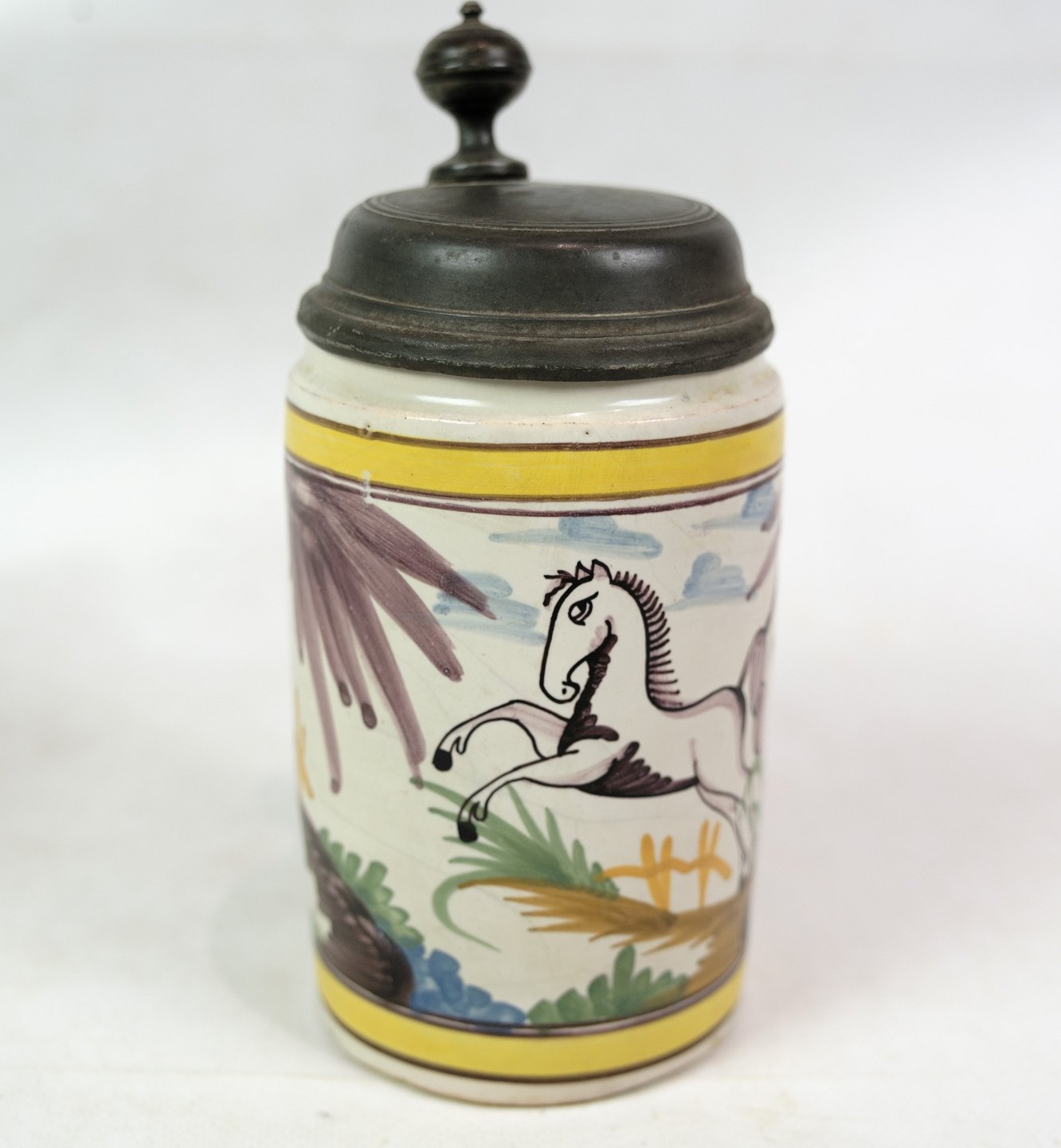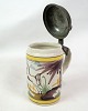 Tysk Kellinghusen lågkrus med motiv af blomster og hest med tin låg fra omkring år 1780'erne.