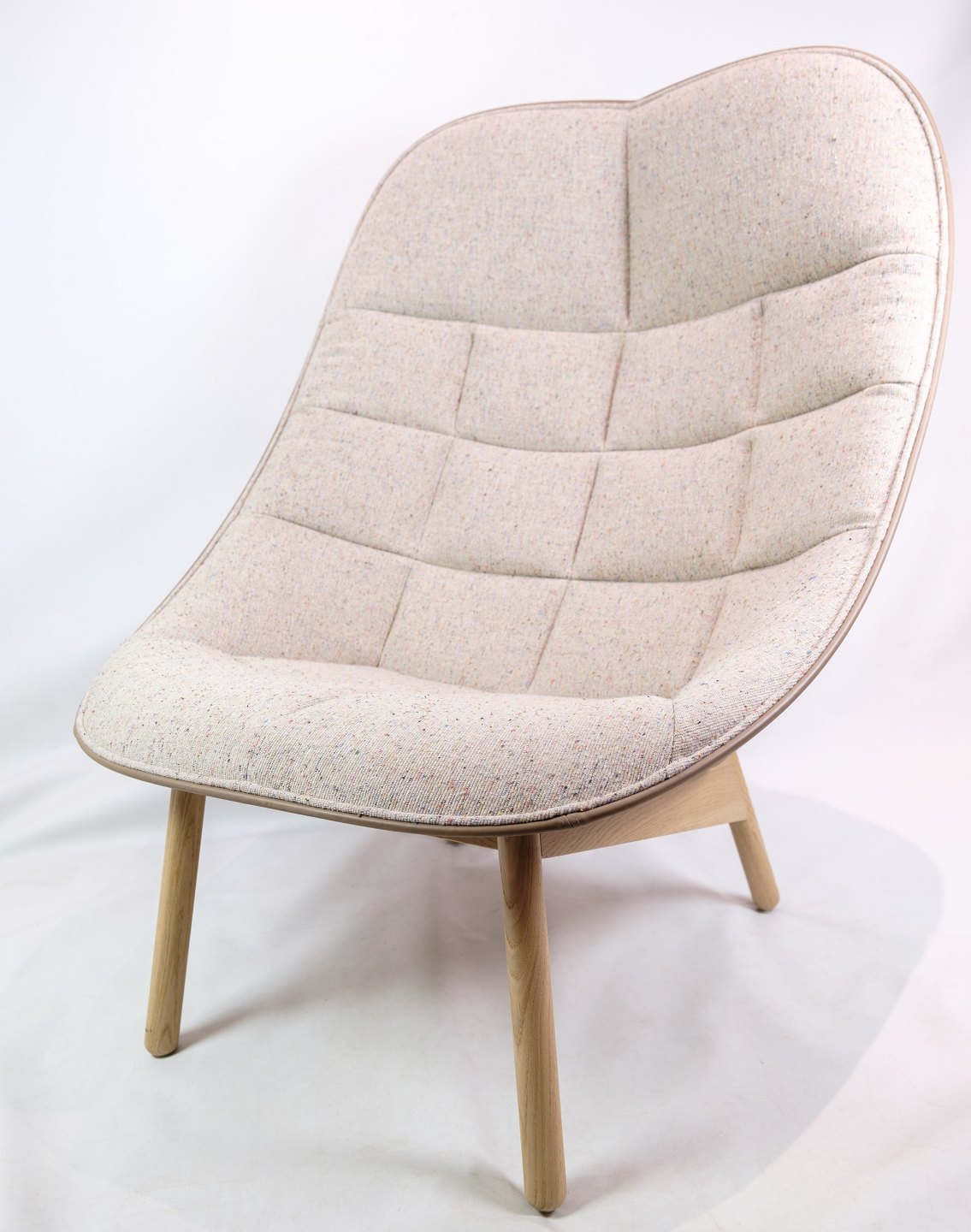 SolgtLænestol, model Quilt, designet af Doshi Levien fremstillet af Hay. Stolen er med stel af egetræ og stoffarven Bolgheri LGG70 / Sense Nougat