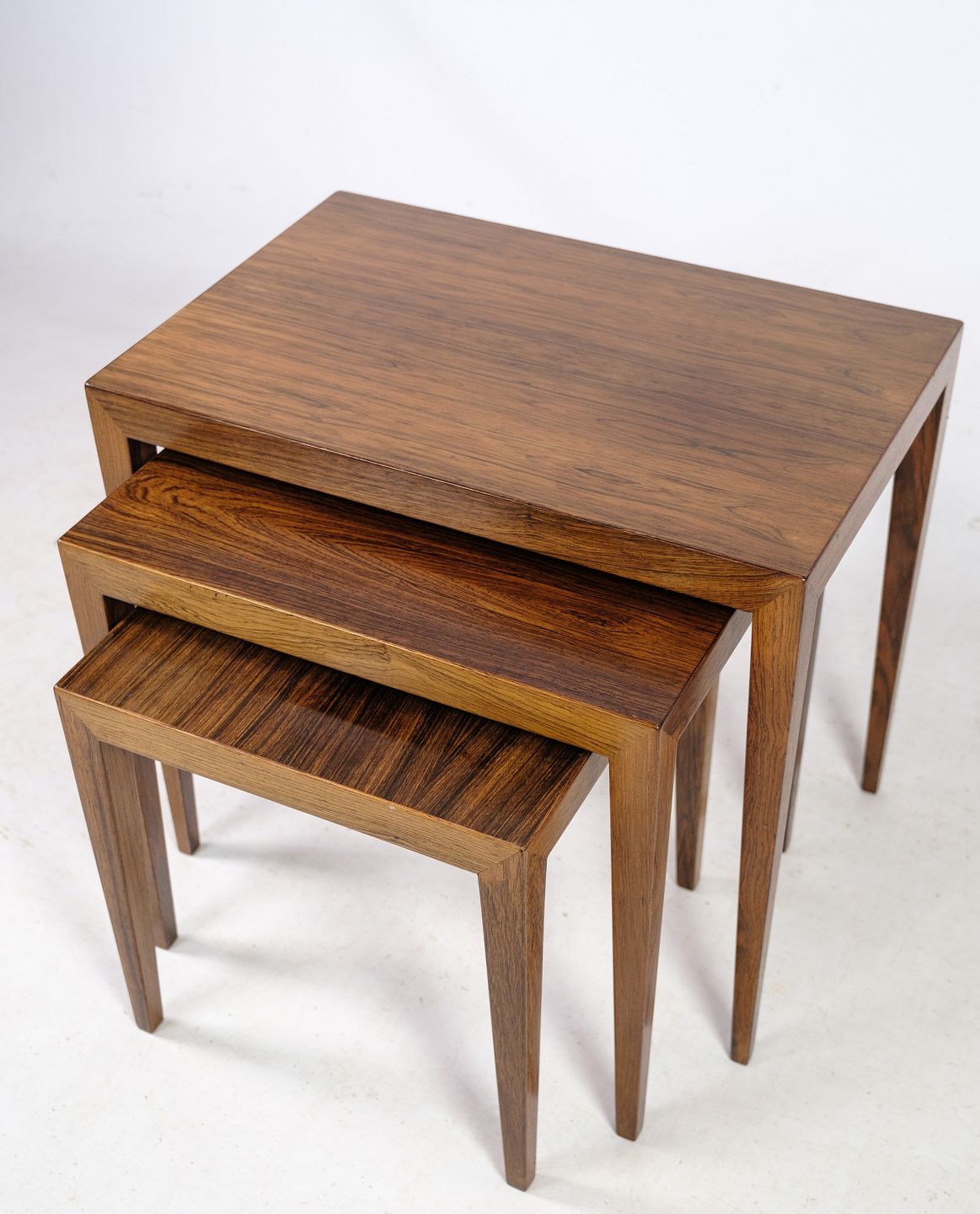 Severin Hansen, en anerkendt dansk møbeldesigner, var kendt for sit talent for at skabe møbler, der balancerede form og funktion på en sublim måde. Disse indskudsborde er ingen undtagelse og viser hans evne til at skabe møbler af både æstetisk appel og praktisk anvendelighed.