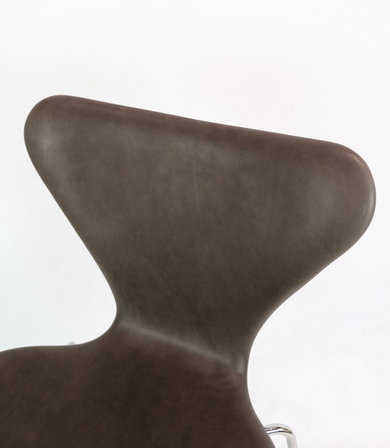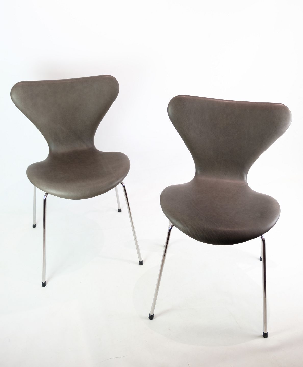 A set of 2 Seven chairs, model 3107, designed by Arne Jacobsen and manufactured by Fritz Hansen. The chairs are upholstered in gray patinated classic leather. We can upholster more on request.