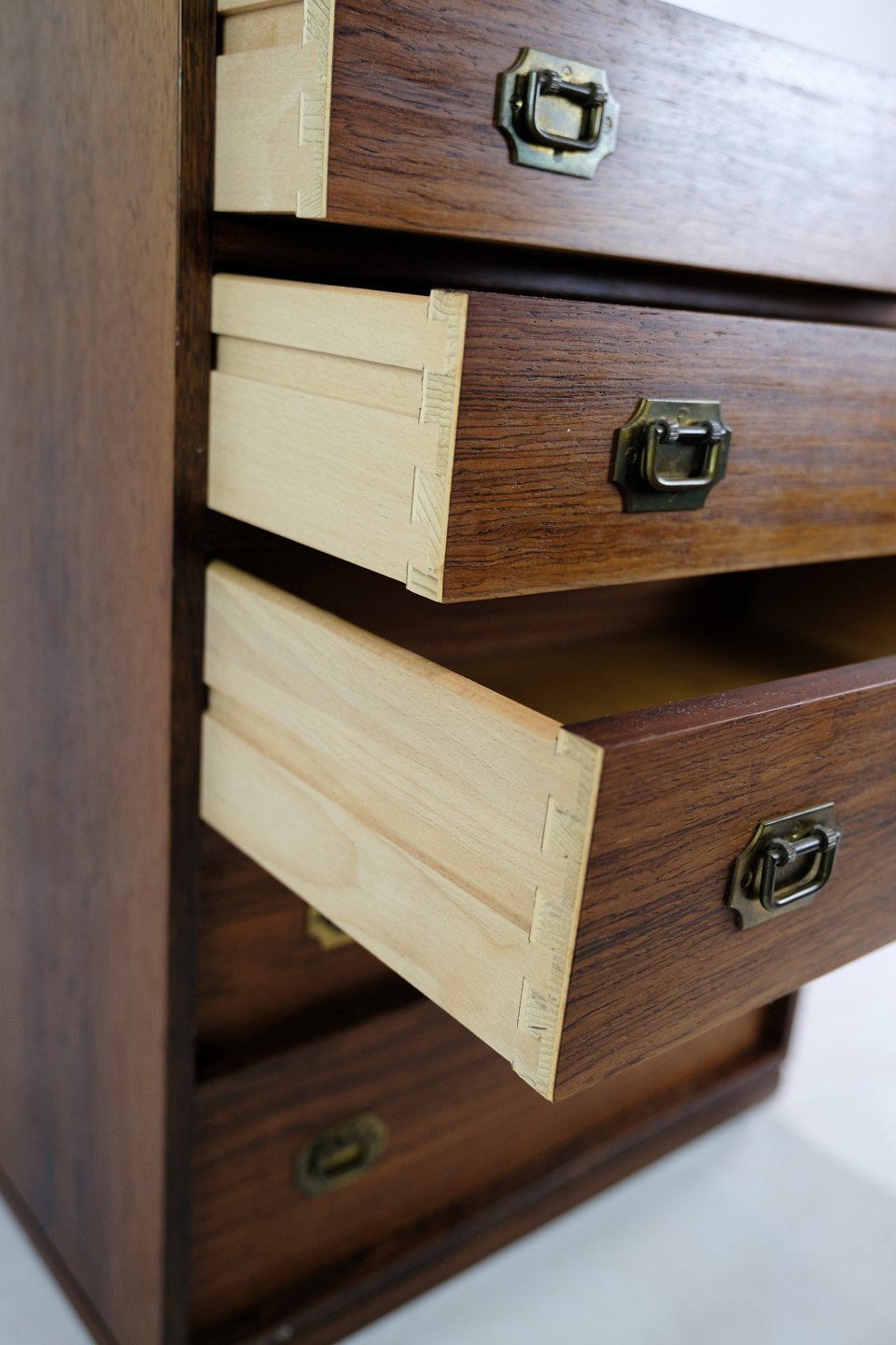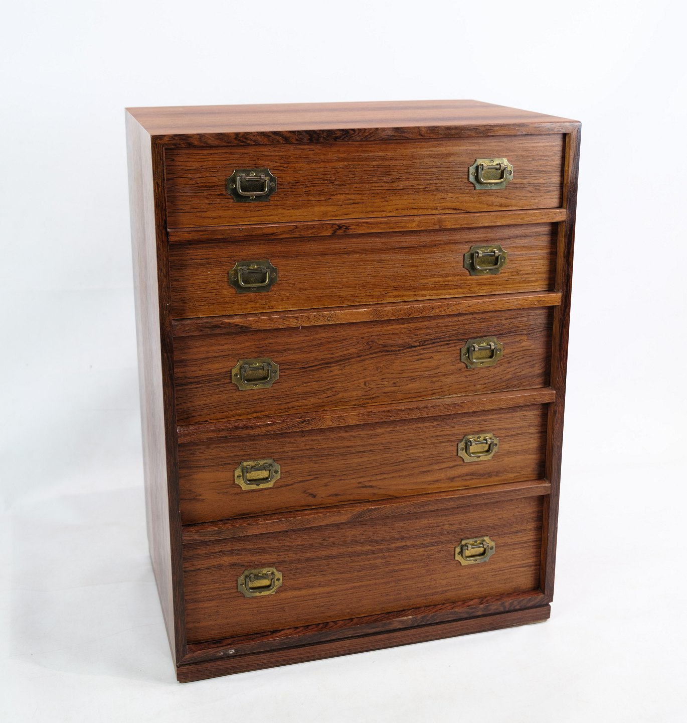 SolgtDette sæt af to kommoder, designet af Henning Korch, er fremstillet i palisandertræ og udgør en elegant og funktionel tilføjelse til ethvert rum. Hver kommode har fem rummelige skuffer med messinggreb, der tilføjer et subtilt touch af luksus til designet. Palisandertræets naturlige varme og smukke tekstur kombineres med den tidløse æstetik og håndværksmæssige kvalitet, som er karakteristisk for Henning Korch's designs. Fremstillet hos Silkeborg Møbelfabrik, er disse kommoder ikke kun smukke, men også holdbare og funktionelle, hvilket gør dem til en værdsat tilføjelse til enhver indretning.