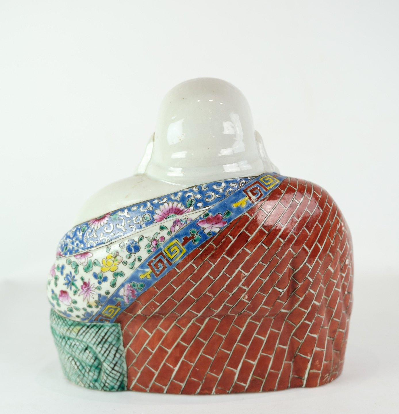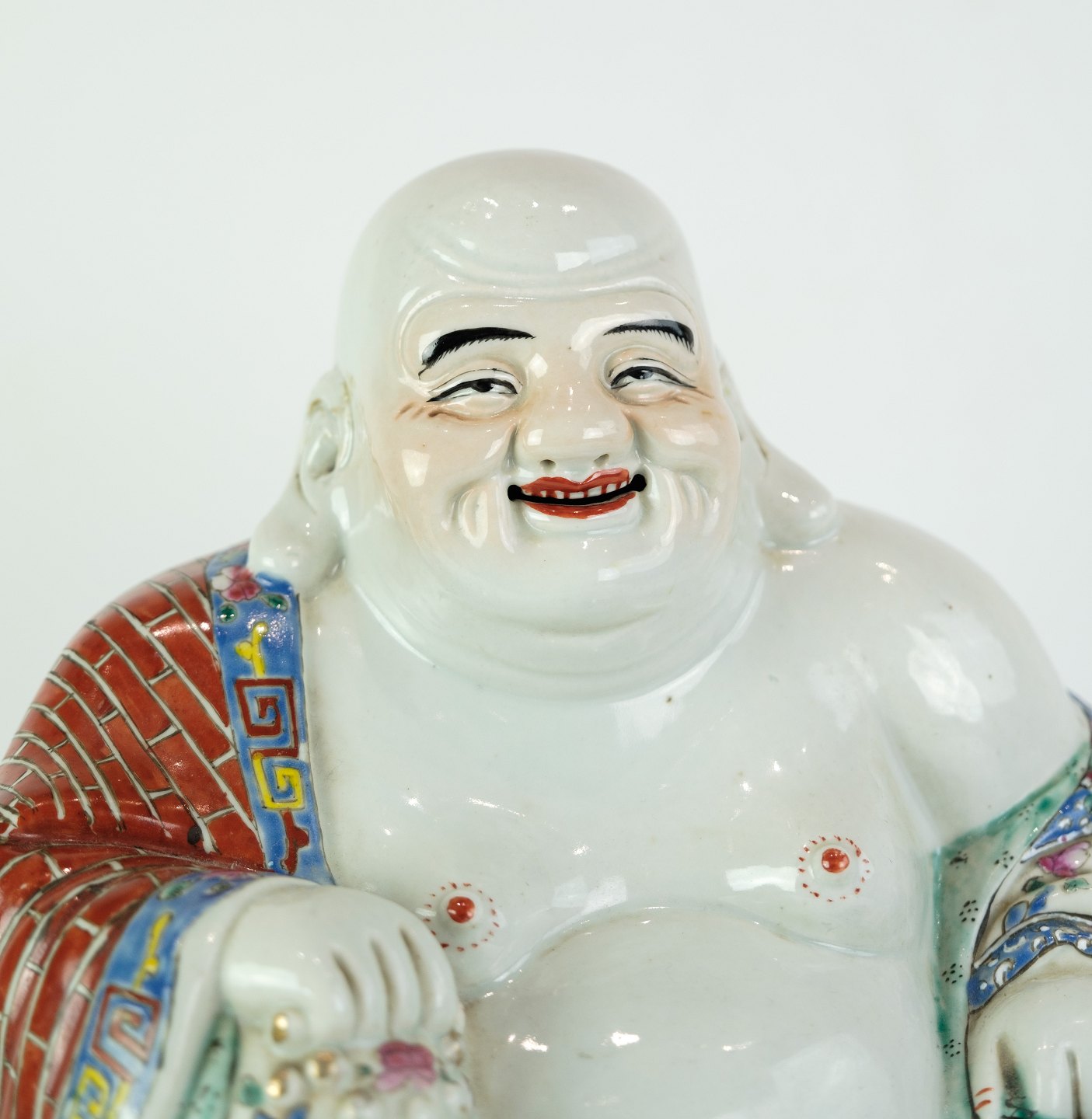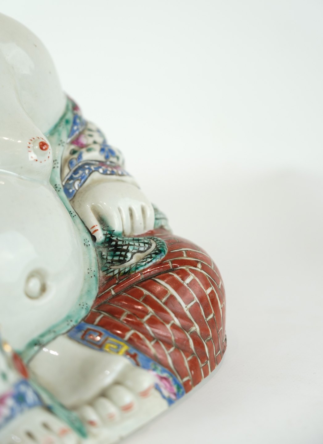 SolgtSiddende Buddha darduse figur af porcelæn dekoreret i lyse of brune farver fra kina omkring 1900-tallet.