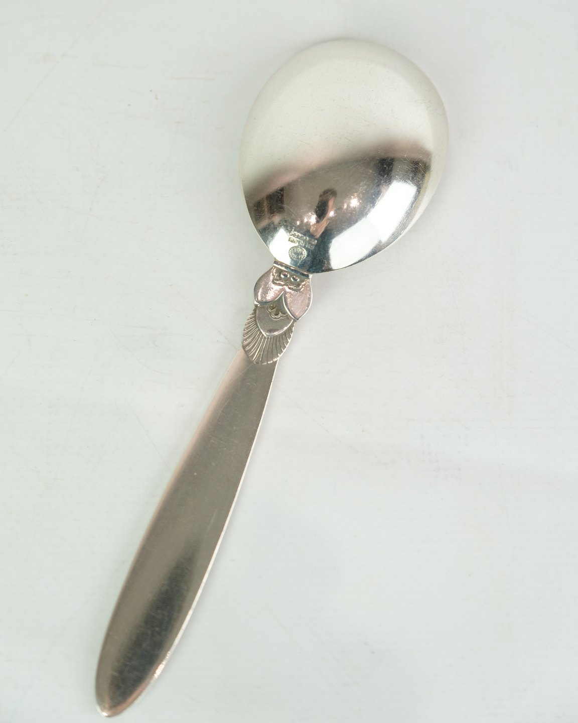This Georg Jensen Kaktus jam spoon in sterling silver is a beautiful and practical addition to your dining table. With a well-known Cactus pattern designed by Gundorph Albertus in 1930 for Georg Jensen Sølvsmedie, Denmark, this spoon exudes tradition, quality and elegance. Although in a nice used condition with normal signs of use, it will still add charm to your breakfast or brunch. Order this unique and beautiful silver cutlery today.
