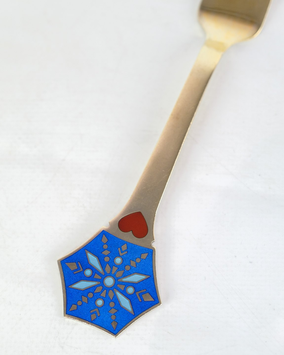 Christmas cutlery by Anton Michelsen is a set of cutlery made of gold-plated sterling silver with an enamel motif. The Christmas spoon 1976 "Snekrystal" is a specific design, drawn by Gudmund Olsen, which was produced by Anton Michelsen. Anton Michelsen was a Danish jeweler and jewelry manufacturer founded in 1841 and known for its high quality and unique designs.