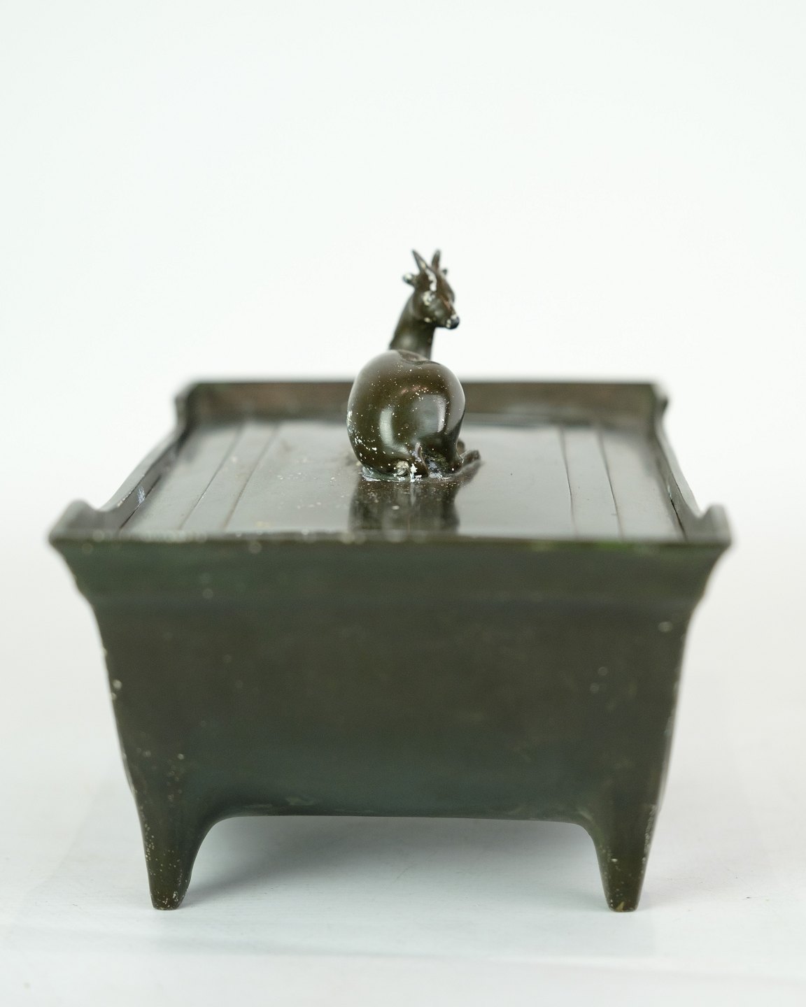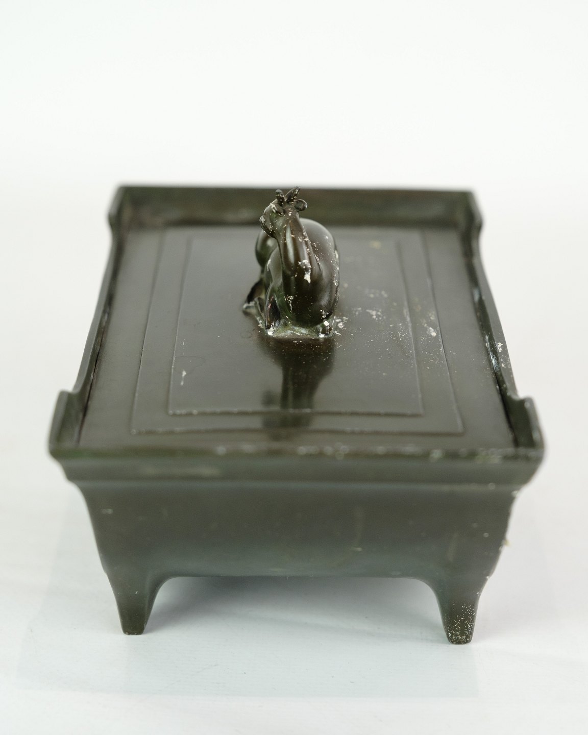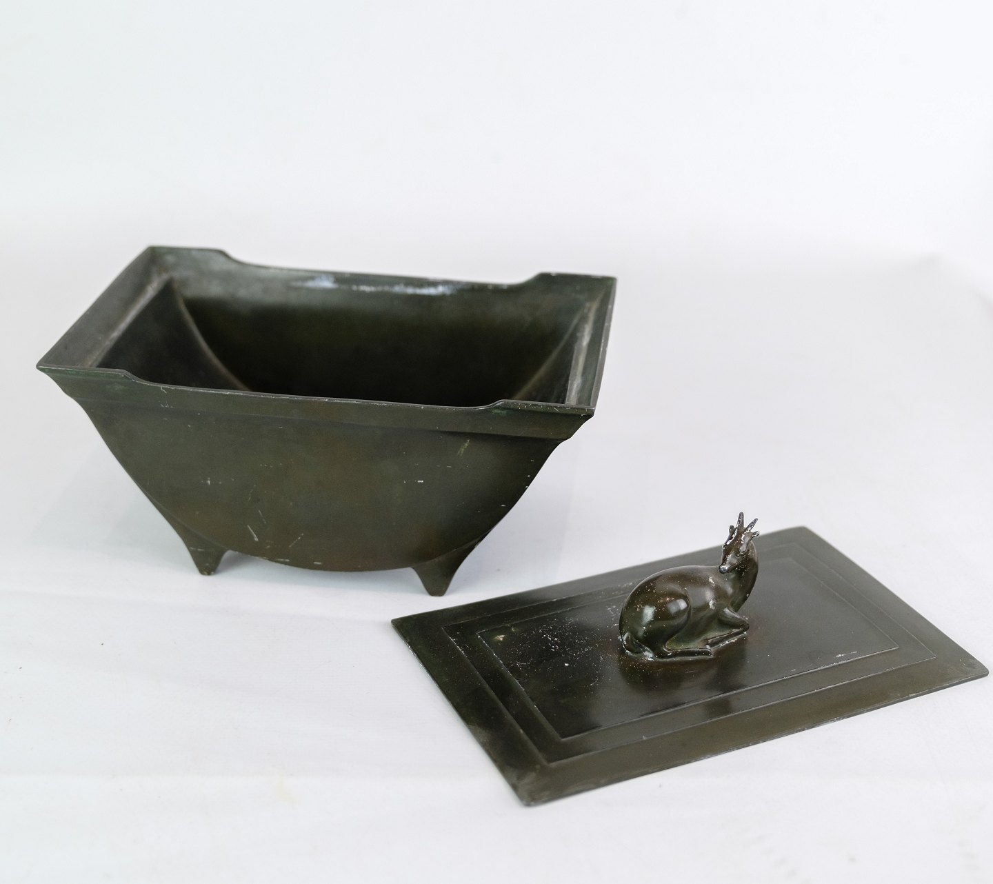 Blikkasse, designet af Just Andersen med dekoration af rådyr tidlig produktion stemplet fra omkring 1940'erne.