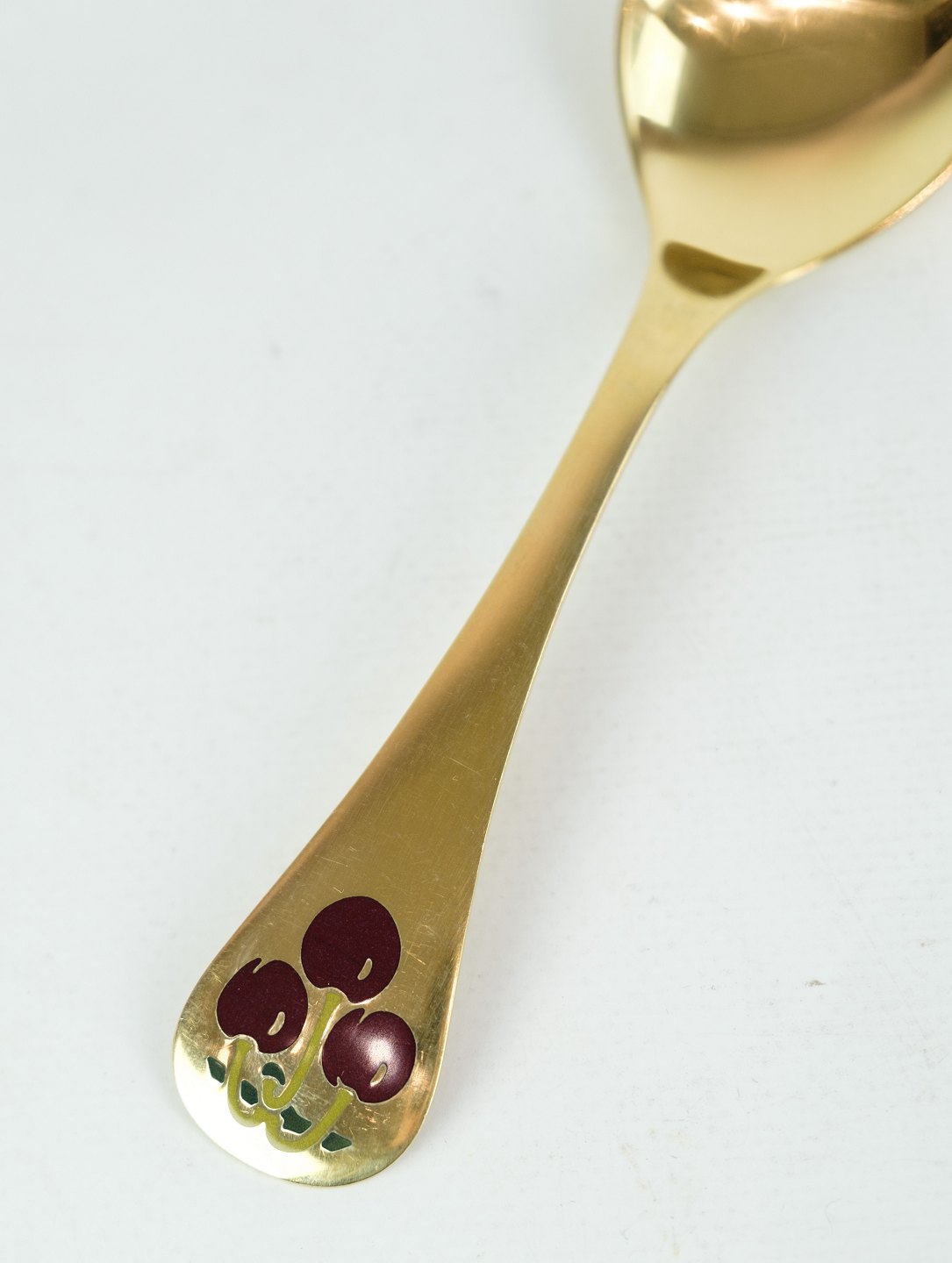 SolgtGeorg Jensen årsske 1997 Kirsebær er et smukt og elegante tilbehør til enhver festlig lejlighed. Det er lavet i forgyldt sterling sølv og har et detaljeret design af kirsebær, der er skabt af den berømte designer Annelise Bjørner (designer for Georg Jensen 1971-03). Skeen er i pæn, brugt stand, og vil være en værdifuld tilføjelse til enhver samling af Georg Jensen-sølvtøj. Med sin unikke og smukke form vil det være et bemærkelsesværdigt element på ethvert bord.