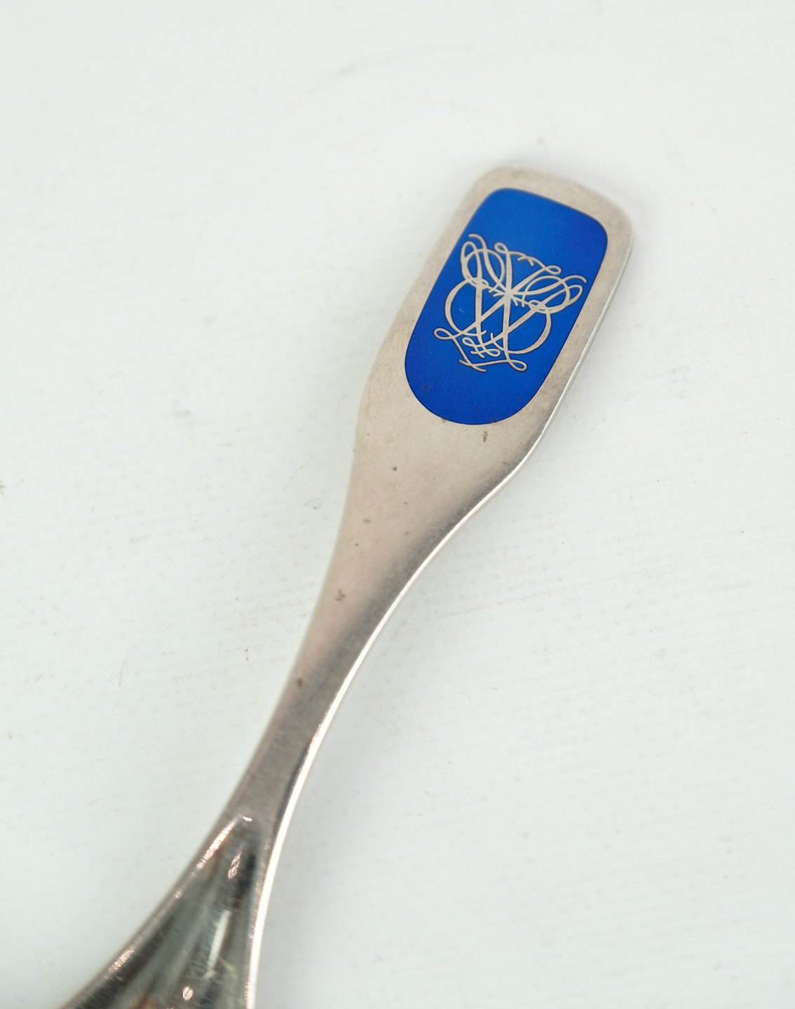 Anniversary spoon from W. & S. Sorensen in 925 sterling silver, Denmark in curtain quality silver with monogram in blue enamel.