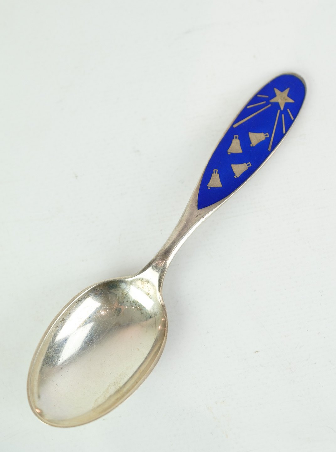 Christmas box by P. Hertz in sterling silver, Denmark with a blue enamel with Christmas bells and star on it
