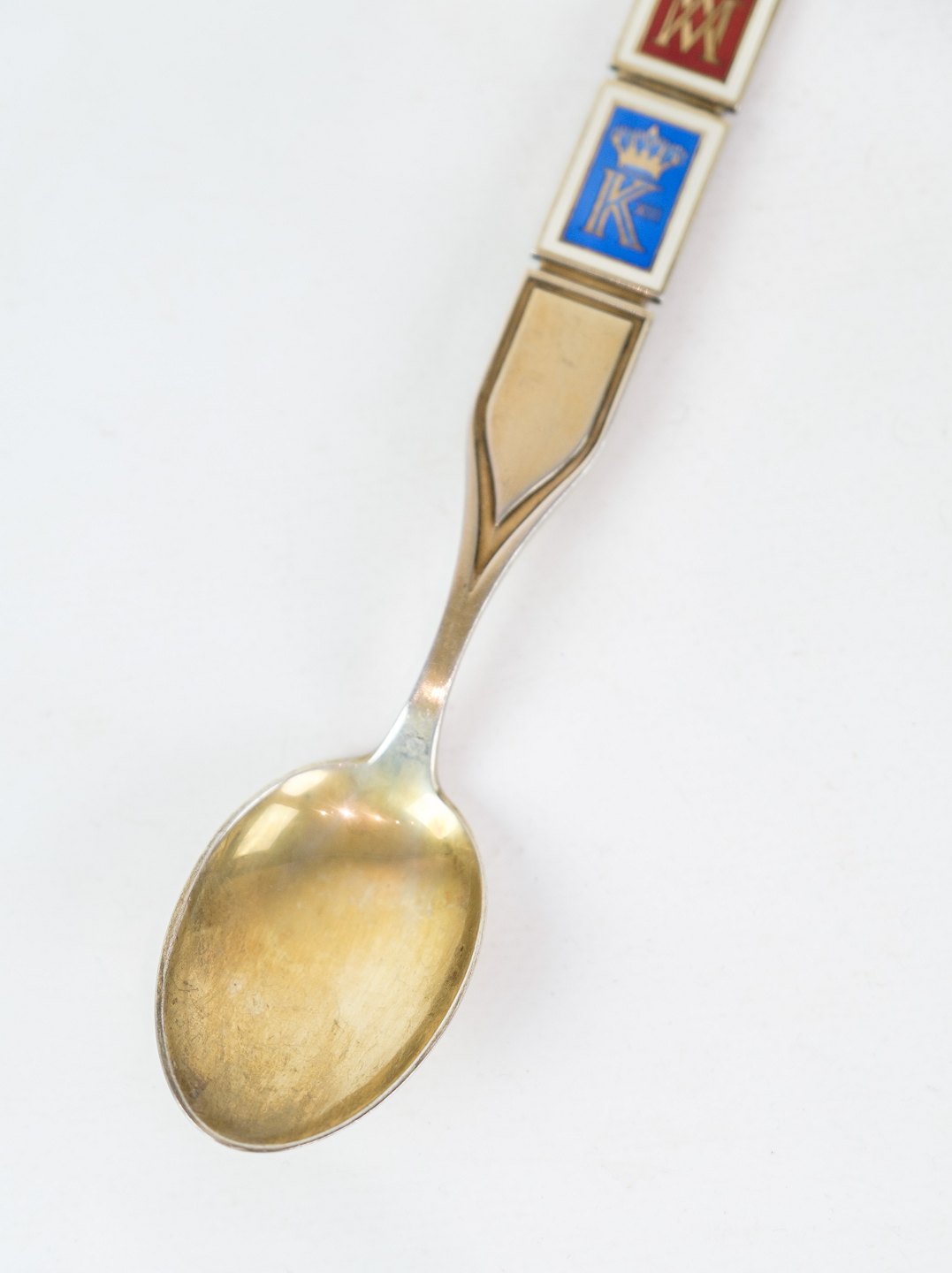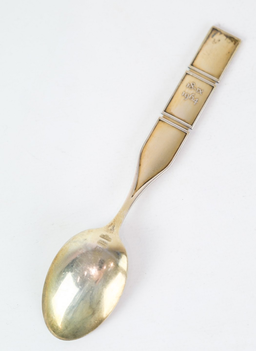 Jubilee spoon by A. Michelsen on the occasion of Queen Anne Marie and King Konstantin's bridal shower 18 September 1964. Designed by Erik Ellegaard Frederiksen.