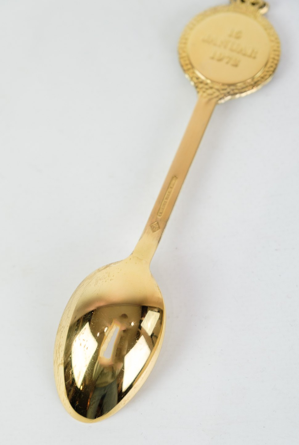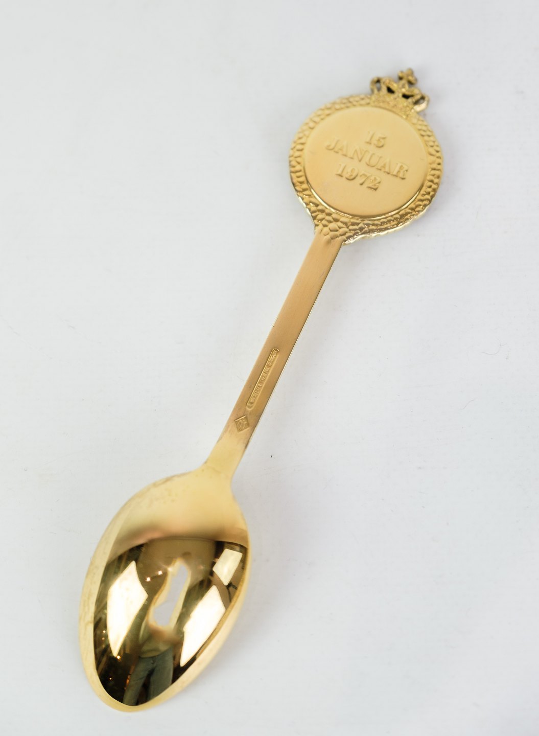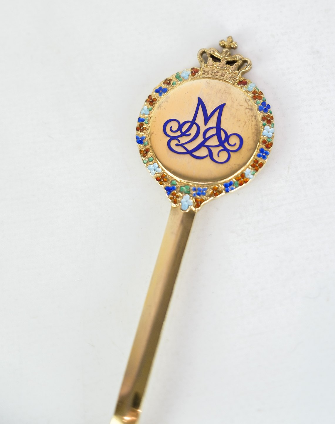 Jubilæumsske af A. Michelsen i anledning af Dronning Margrethe II's kroning, sterlingsølv. Fremstillet af forgyldt sterlingsølv med emaljedekoration.