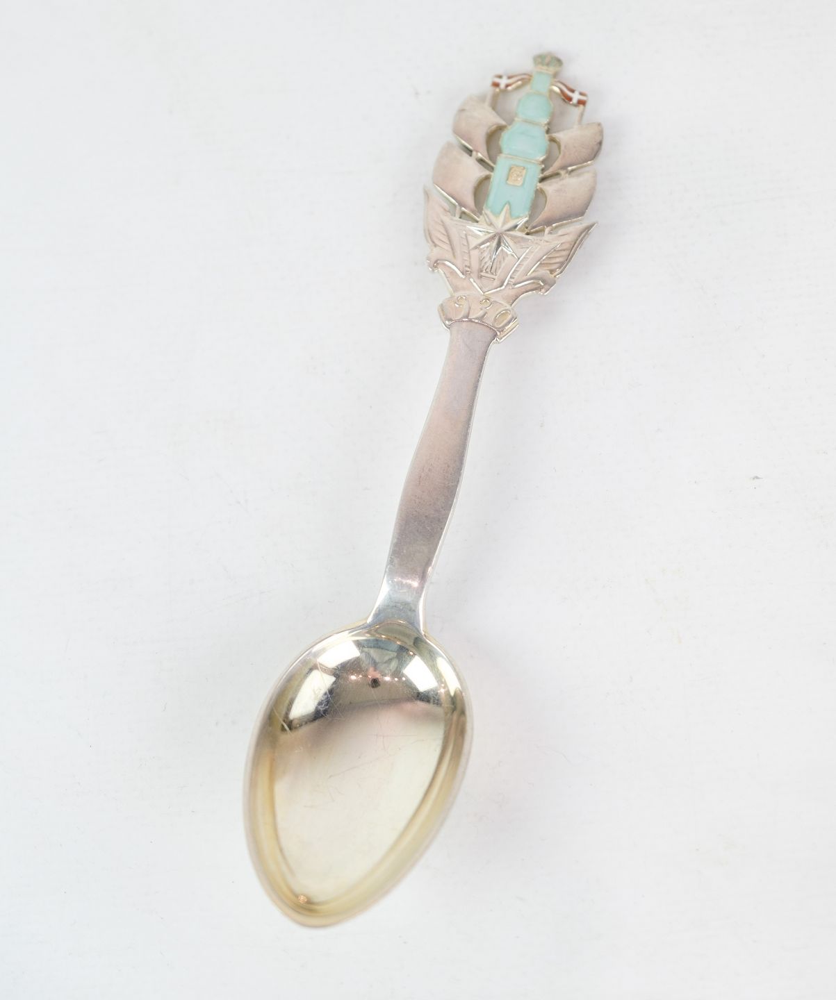 Jubilæumsske i tretårnet sølv med danske flag af meget god kvalitet. I fin brugt stand.