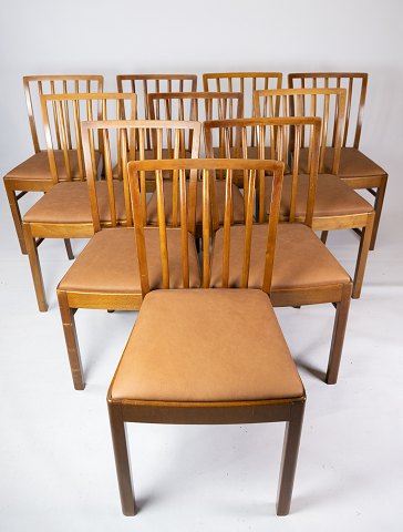 A set of 6 Seven chairs, model 3107, designed by Arne Jacobsen and manufactured by Fritz Hansen. The chairs are upholstered in light brown elegance leather and in very nice used condition with original patina.