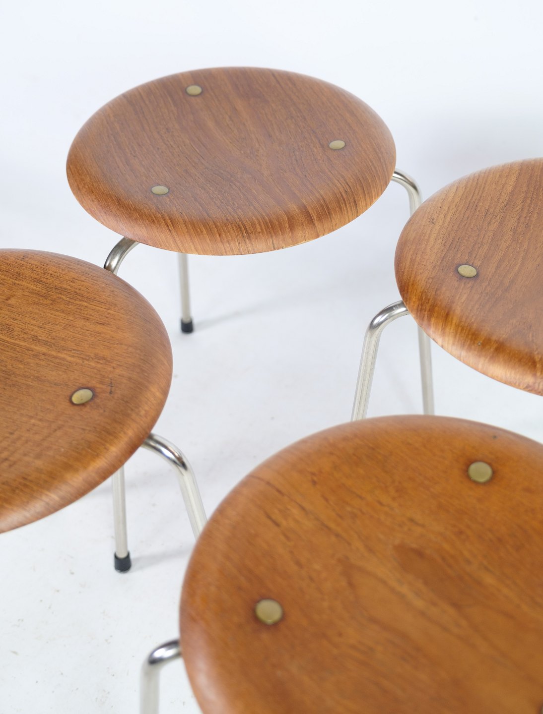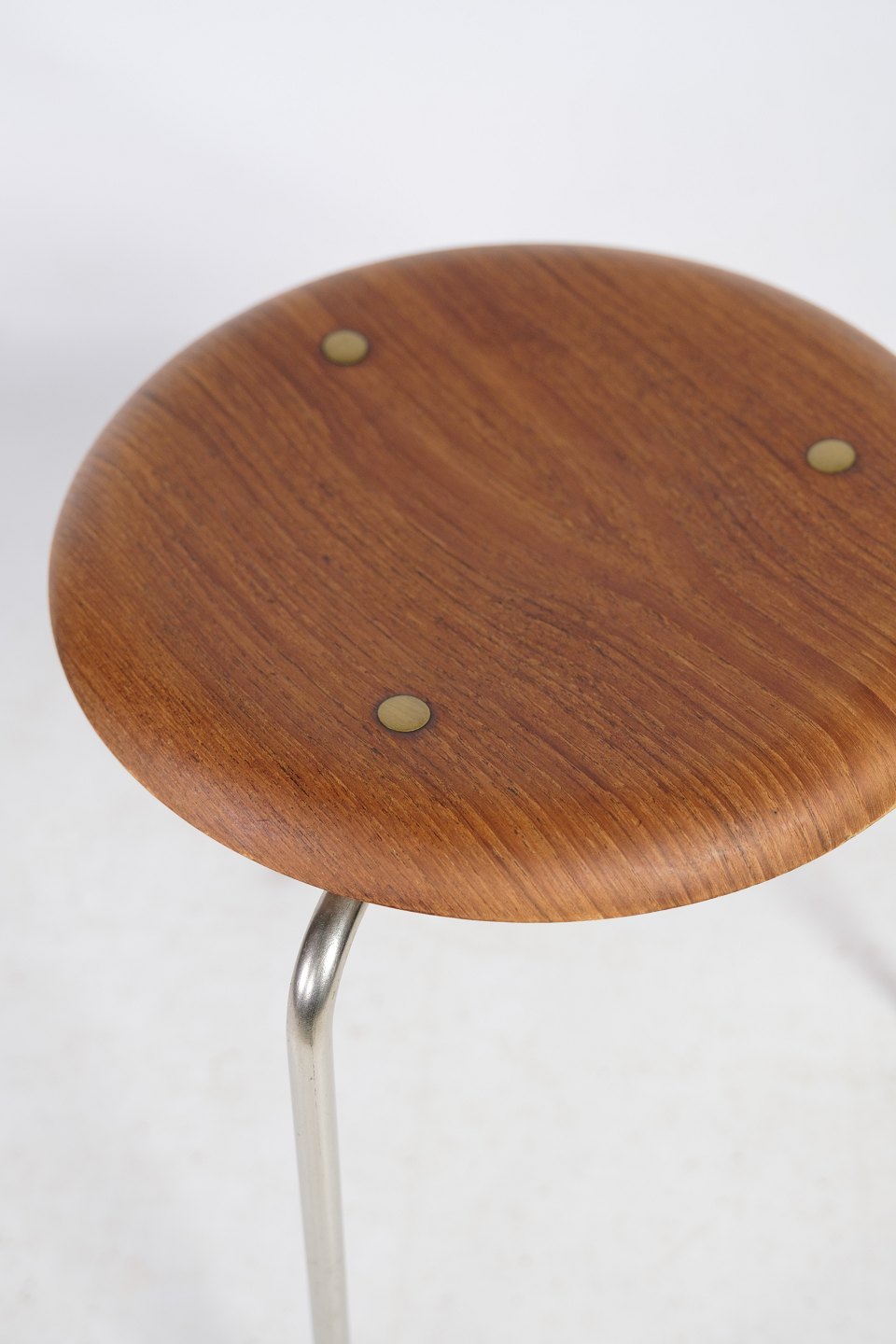 This elegant stool with three legs was designed by the famous Danish architect and designer Arne Jacobsen and was manufactured by Fritz Hansen in the 1960s. The stool is an early model and shows Arne Jacobsen's talent for simplicity and functionality.
