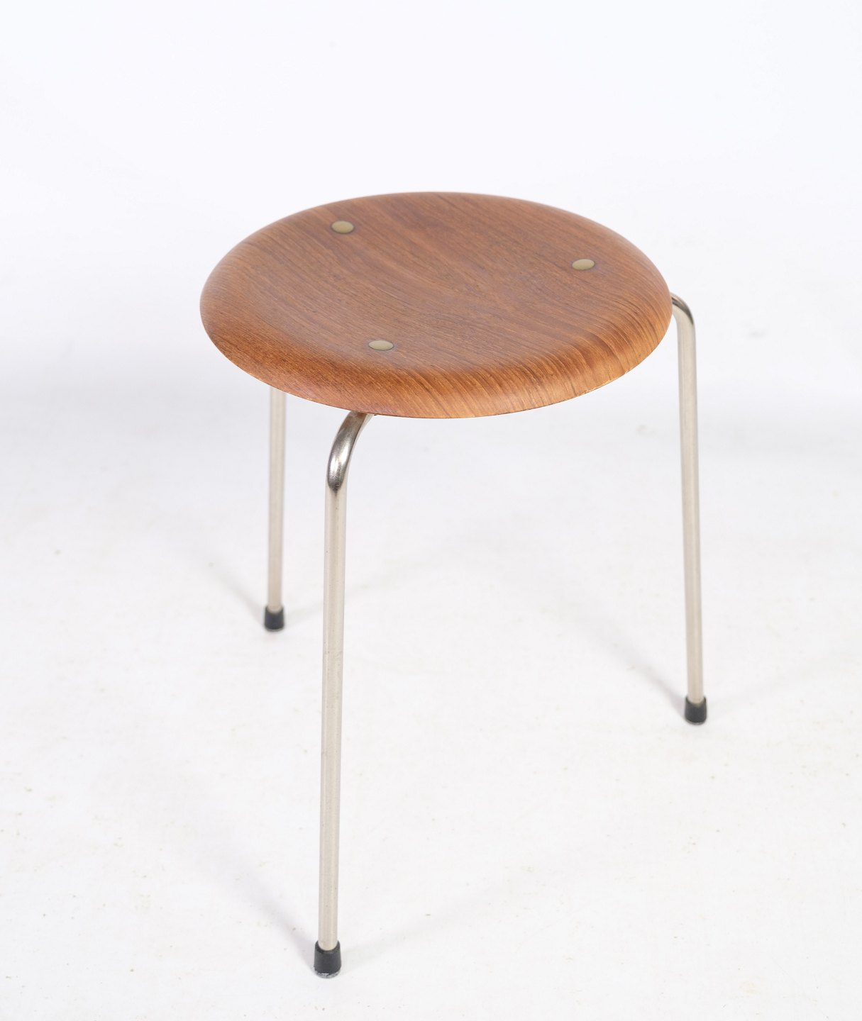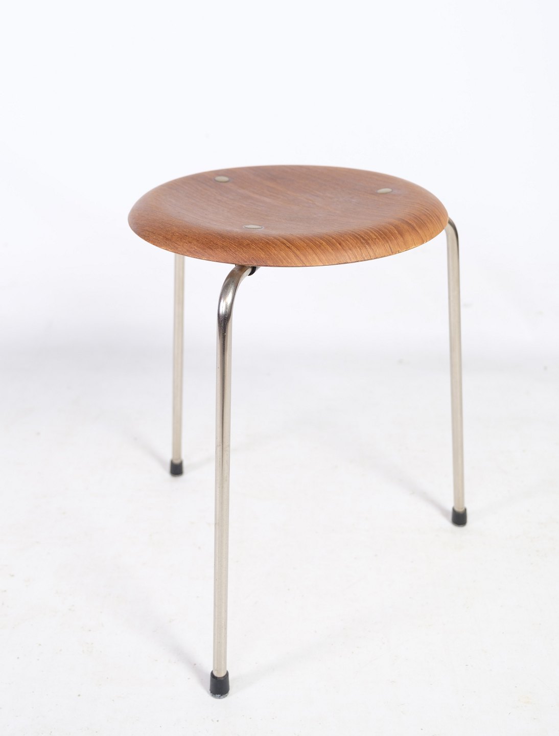 Stool with three legs, chrome-plated metal, teak veneer seat. Fritz Hansen, Arne Jacobsen, Early model. The 1960s.