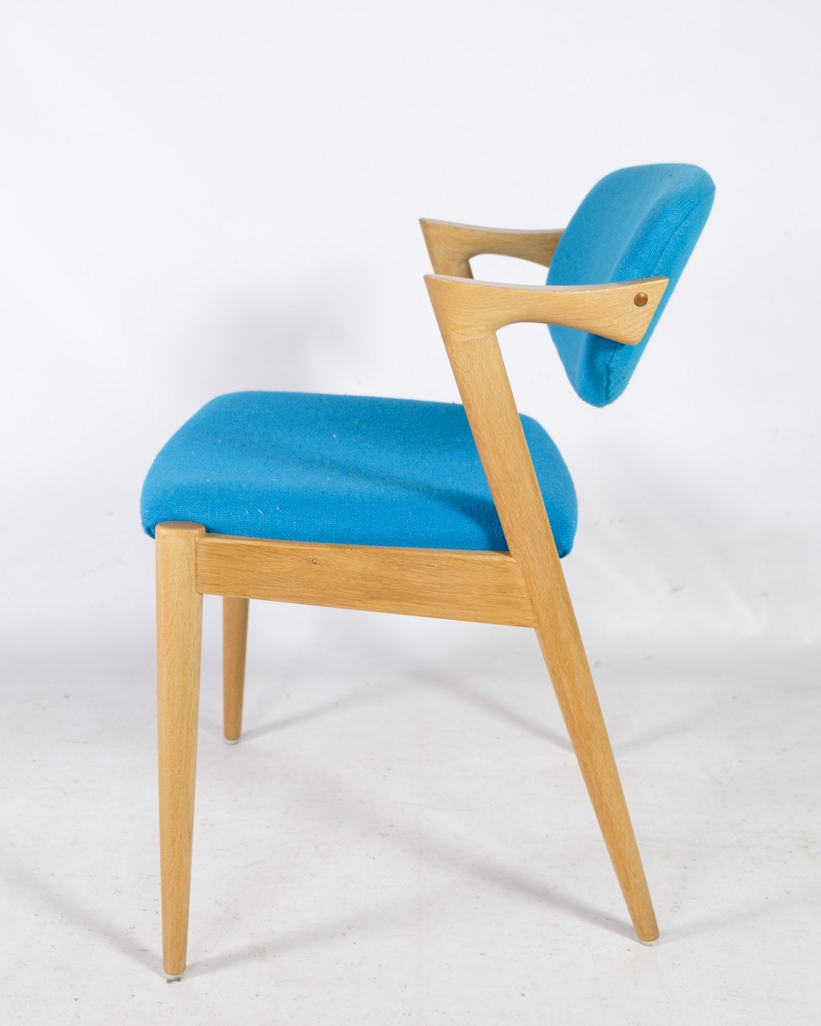 The chairs have a classic and minimalist design with an organic shape that is both comfortable and aesthetically pleasing. The seat is upholstered in blue fabric, which adds an extra dimension of elegance and luxury, while the legs are made of oak.