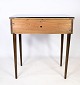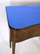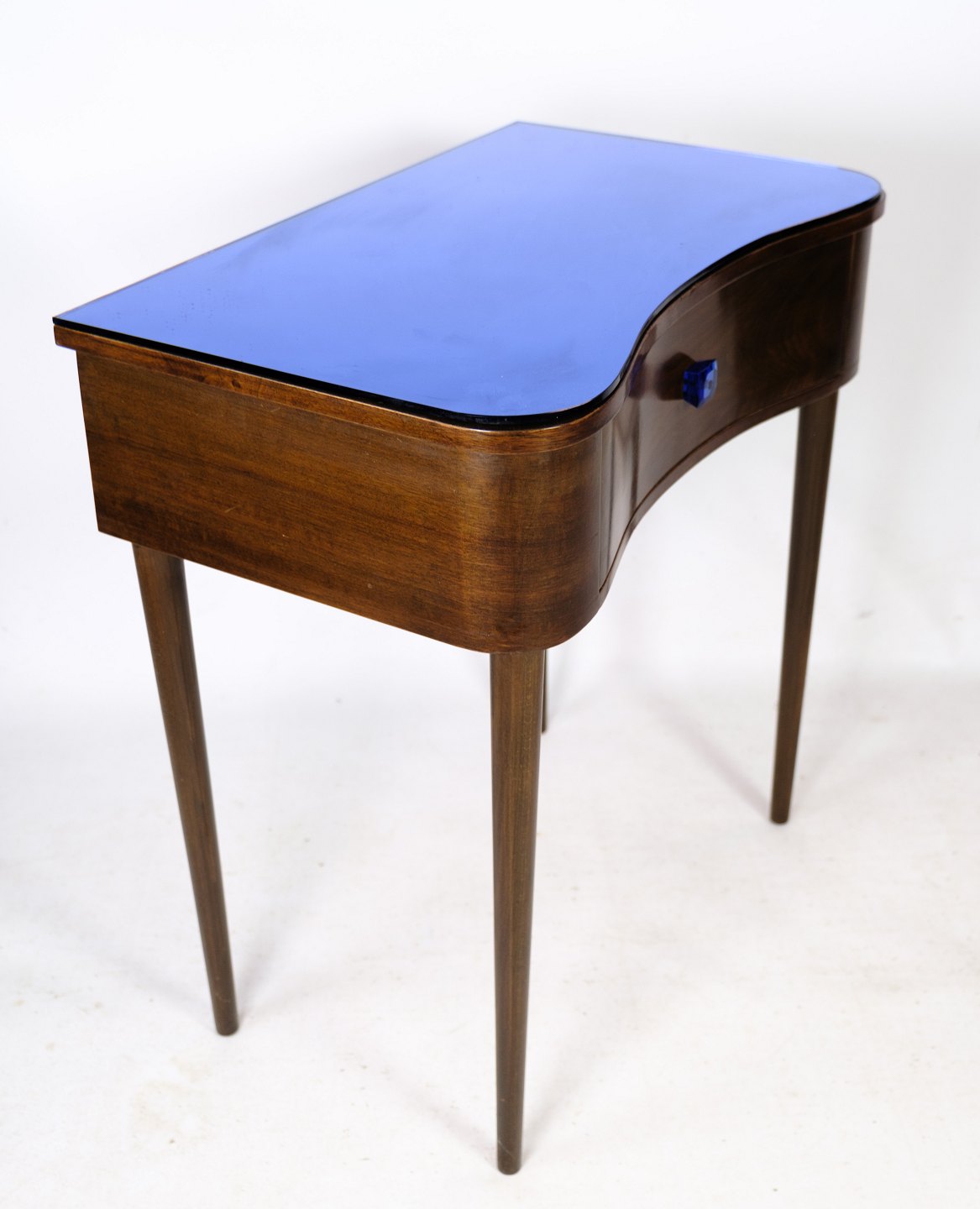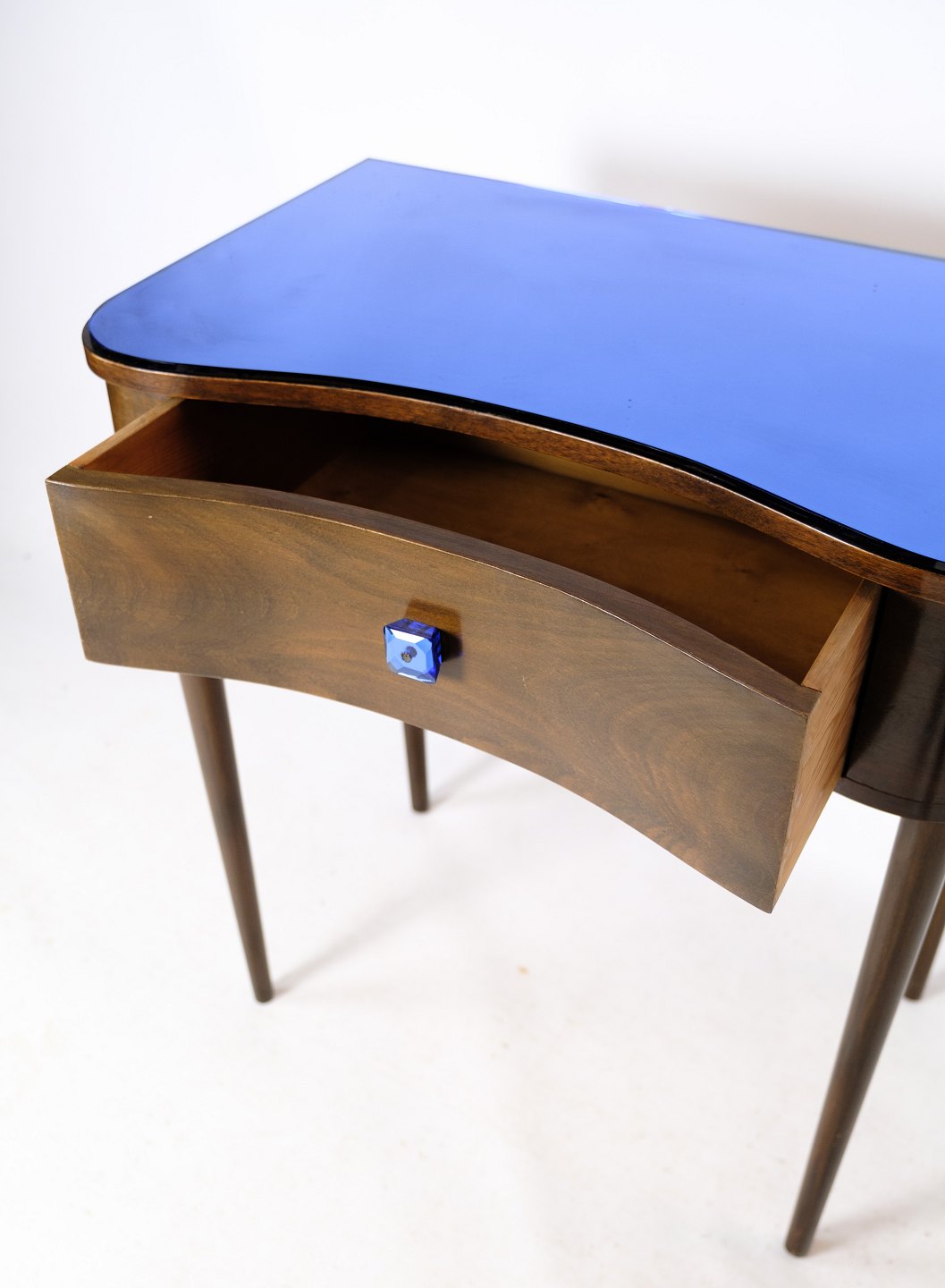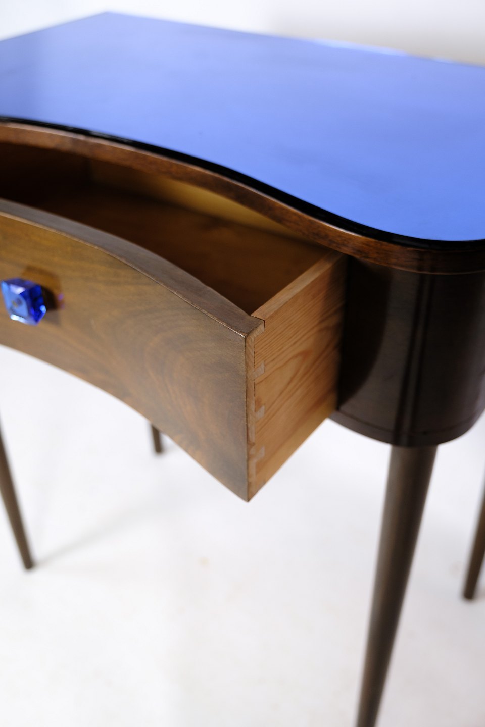 SoldSmall lady's desk / side table in mahogany with blue glass leaves and handles on drawer from around the 1920s.