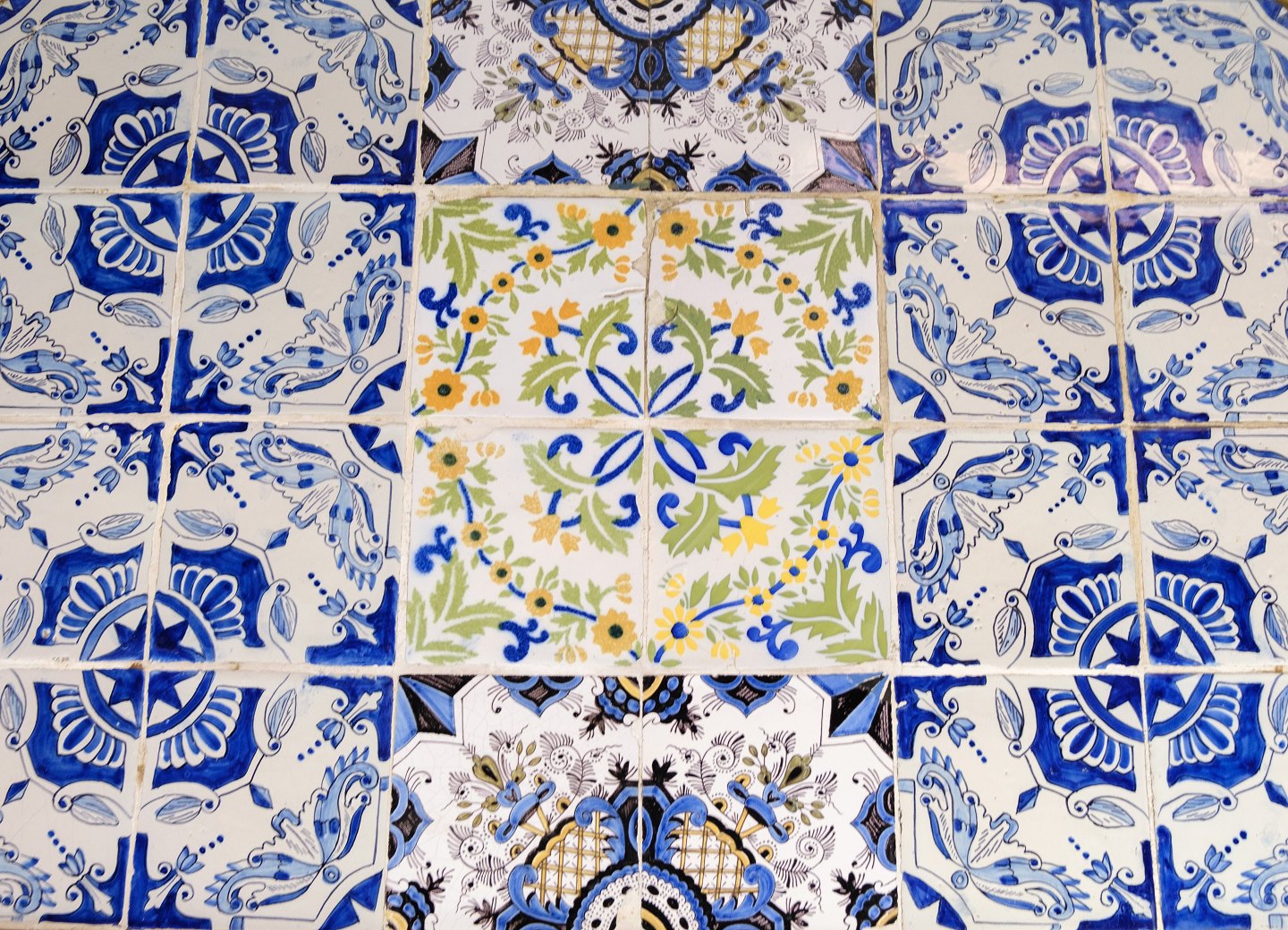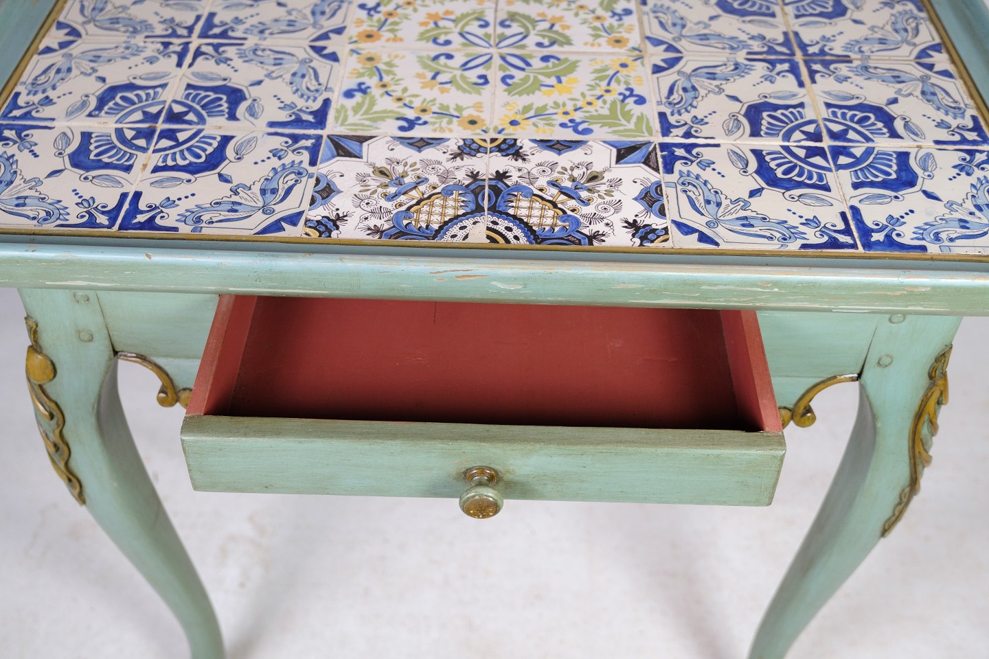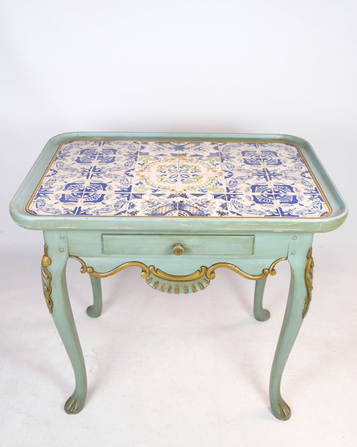 Painted rococo shaped tile table decorated with various motifs. The table is from the 1780s and is in beautiful antique condition.
