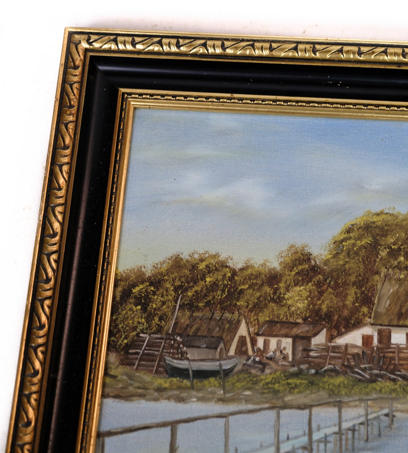 Painting on the canvas in an antique frame of a farmhouse and water from around the 1930s