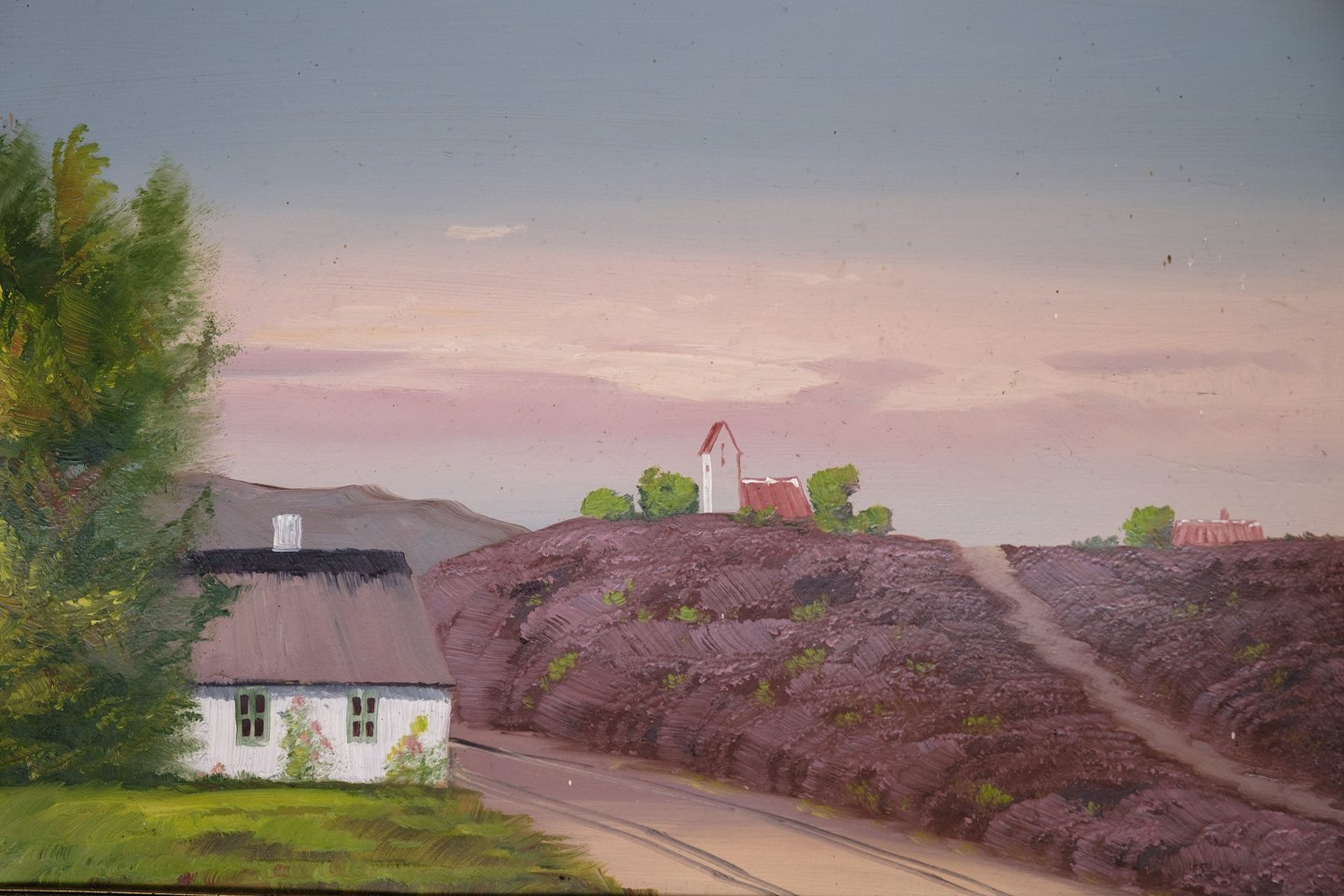 Maleri på træplade i antik ramme af små huse og natur fra omkring 1930'erne