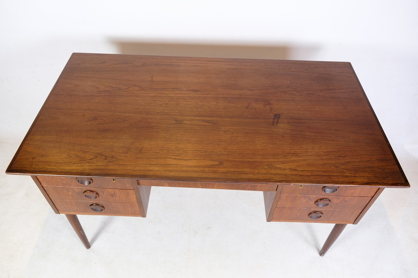The desk has three spacious drawers on each side and an additional drawer in the middle, providing ample storage space for your office supplies and documents. The warm tone of the teak wood adds a natural beauty to the room, while the Danish design brings a timeless elegance.