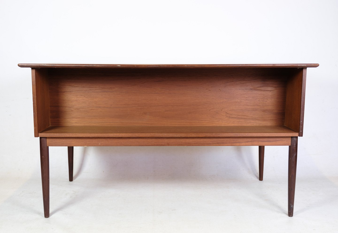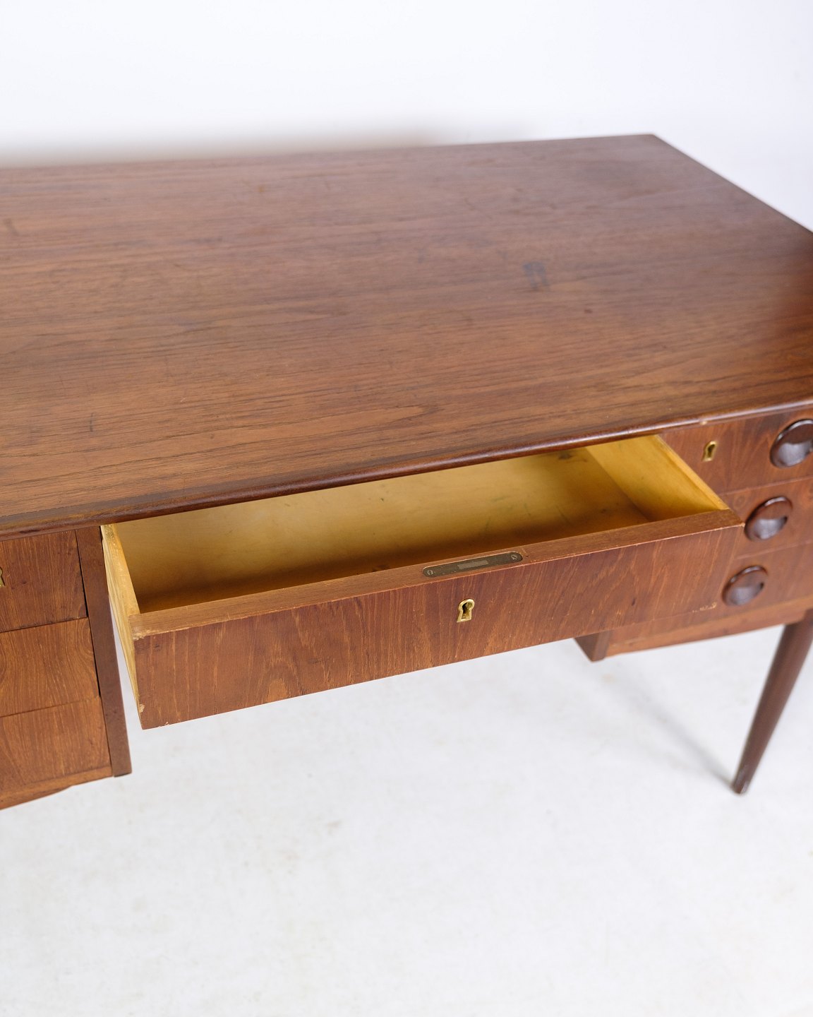 This desk in teak wood from around the 1960s is a beautiful example of Danish design aesthetics and functionality. With its elegant construction and fine details, it offers a perfect balance between style and utility.