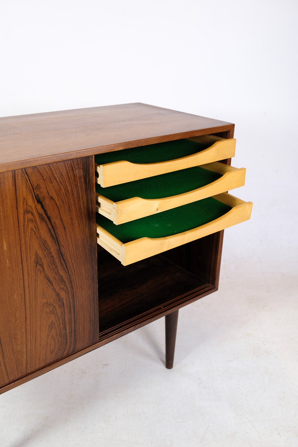 SolgtEn lille kommode med front af to skydedøre bag med hylder og skuffer i palisander med tilspidsede ben fremstillet af Dansk Møbelproducent omkring 1960'erne.