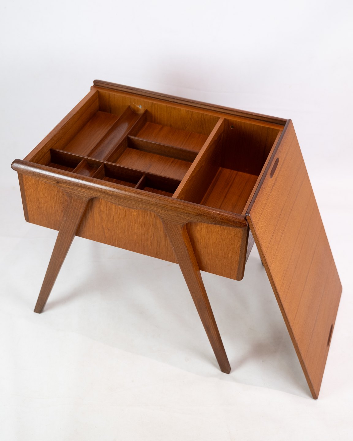 Det minimalistiske og elegante design af sybordet fra omkring 1960'erne er kendetegnet ved rene linjer og funktionalitet. Dansk design fra denne æra fokuserede ofte på at kombinere form og funktion for at skabe tidløse og brugervenlige møbler.