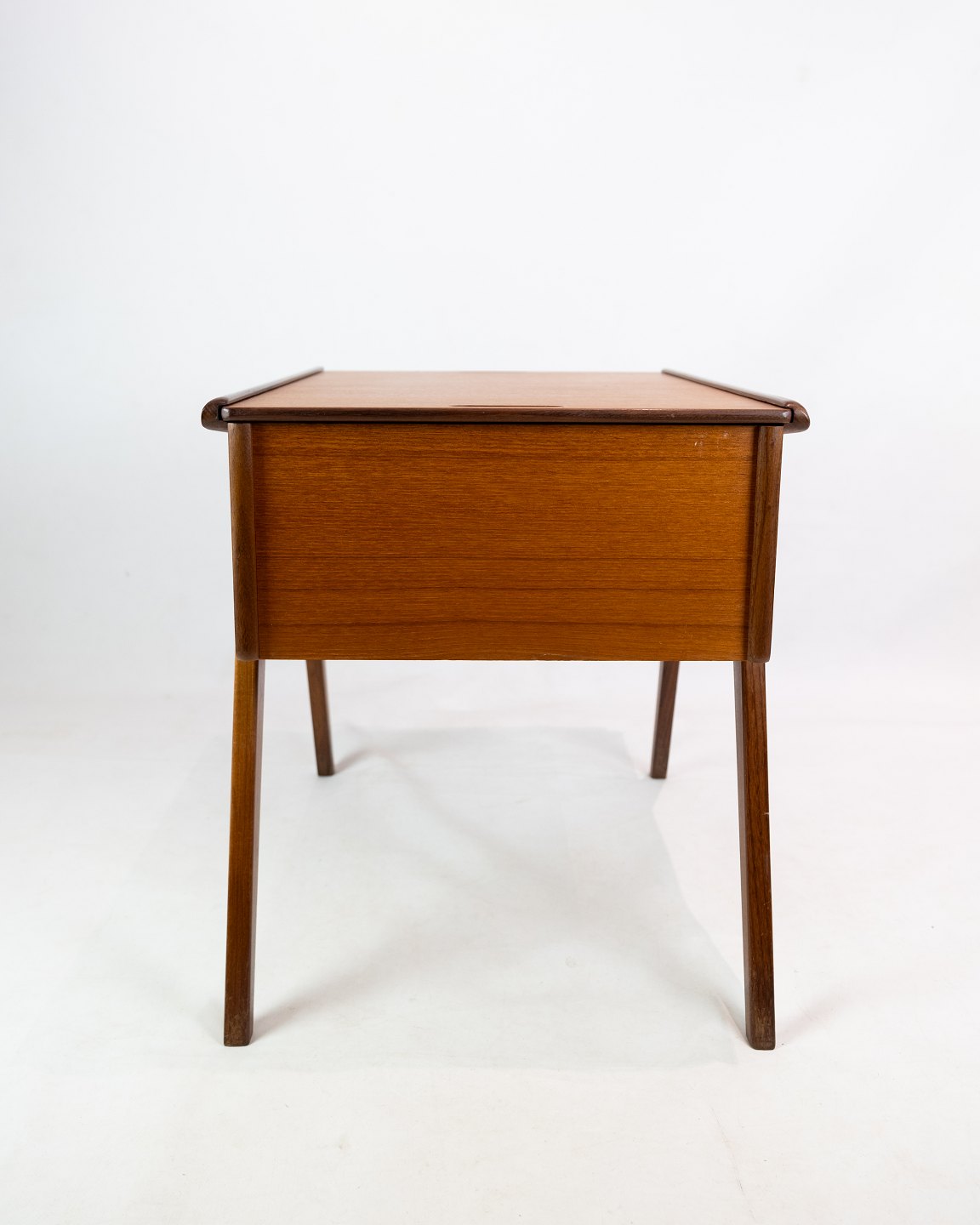 Teaktræet er kendt for sin varme farve og naturlige skønhed, hvilket gør det til et populært materiale i dansk møbeldesign i 1960'erne. Sybordet vil sandsynligvis have en dejlig glød og et karakteristisk mønster i træet, der tilføjer en varm og indbydende atmosfære til ethvert rum.