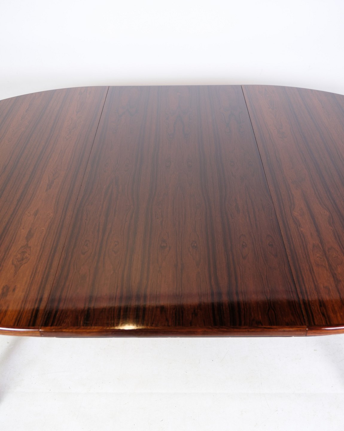 Overall, the dining table is in rosewood, designed by Oman Jun. A/S, model no. 55, from the 1960s a tribute to Danish furniture design tradition. With its rosewood construction and timeless design, it represents the aesthetics and quality so characteristic of the period and will no doubt continue to add style and elegance to modern interiors.
