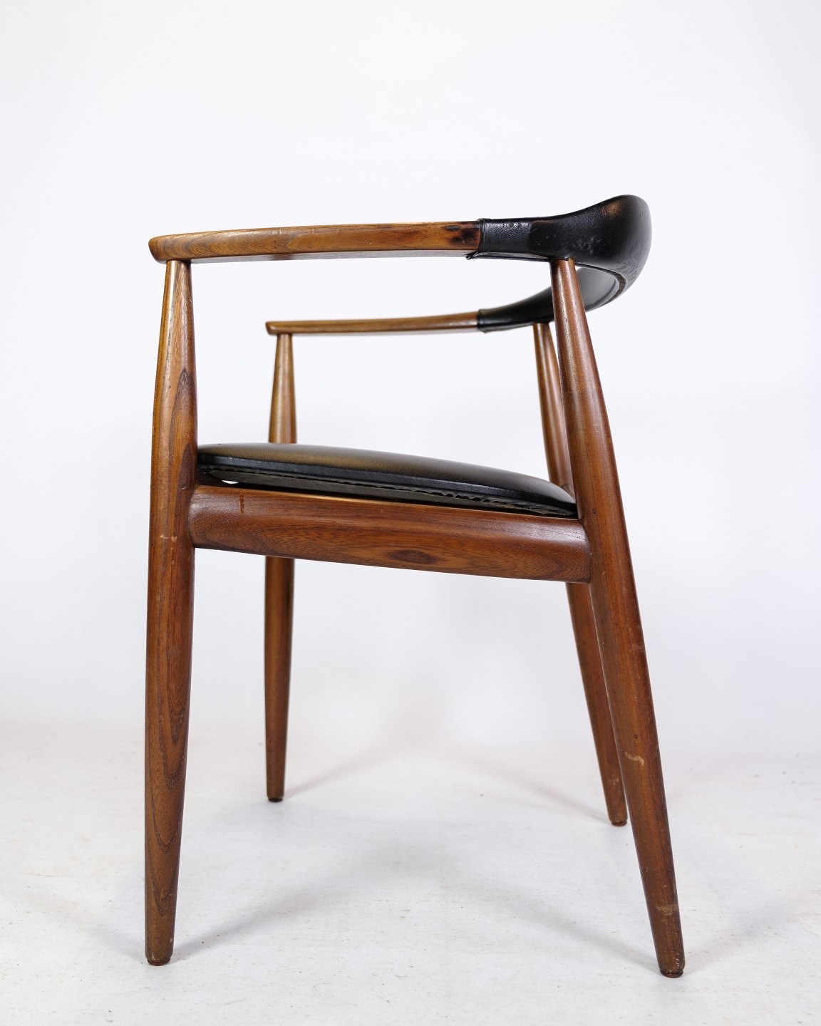 SolgtArmstol i teaktræ og sort kunstlæder, designet af Illum Wikkelsø for Niels Eilersen fra omkring 1960'erne.