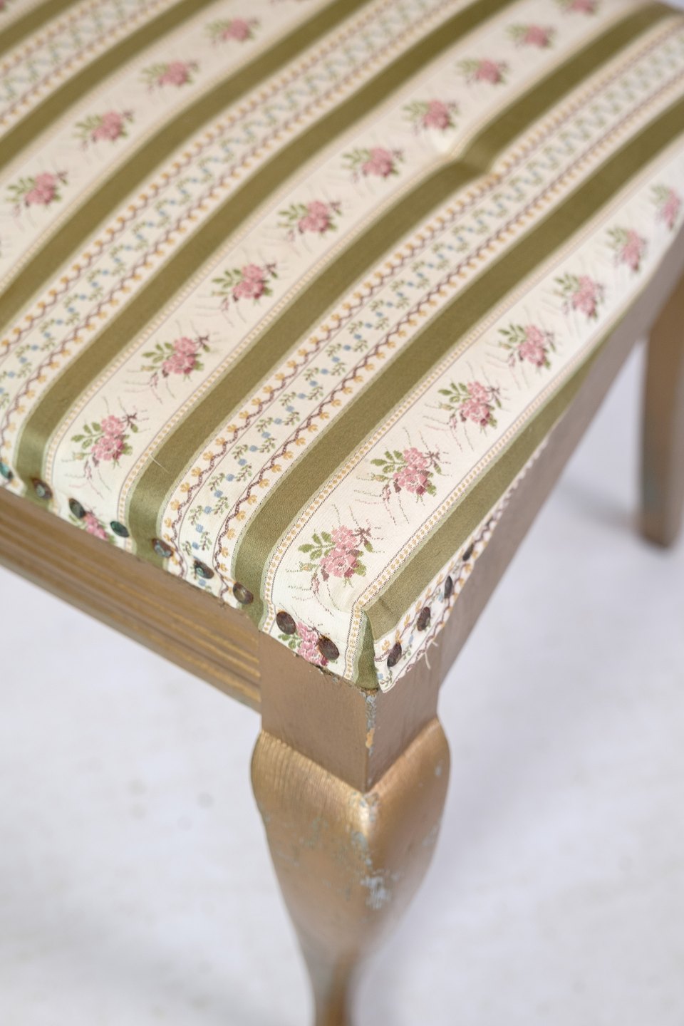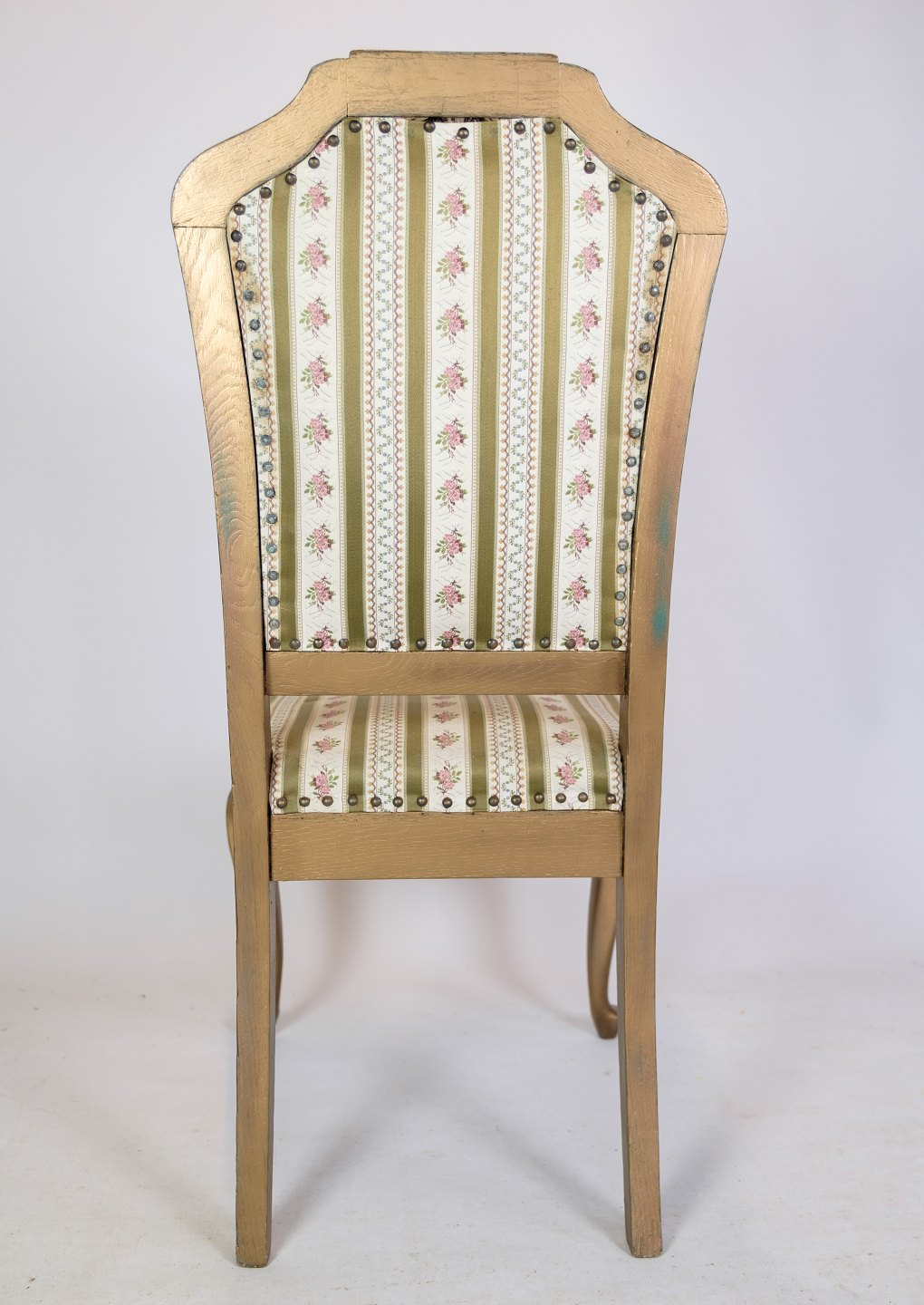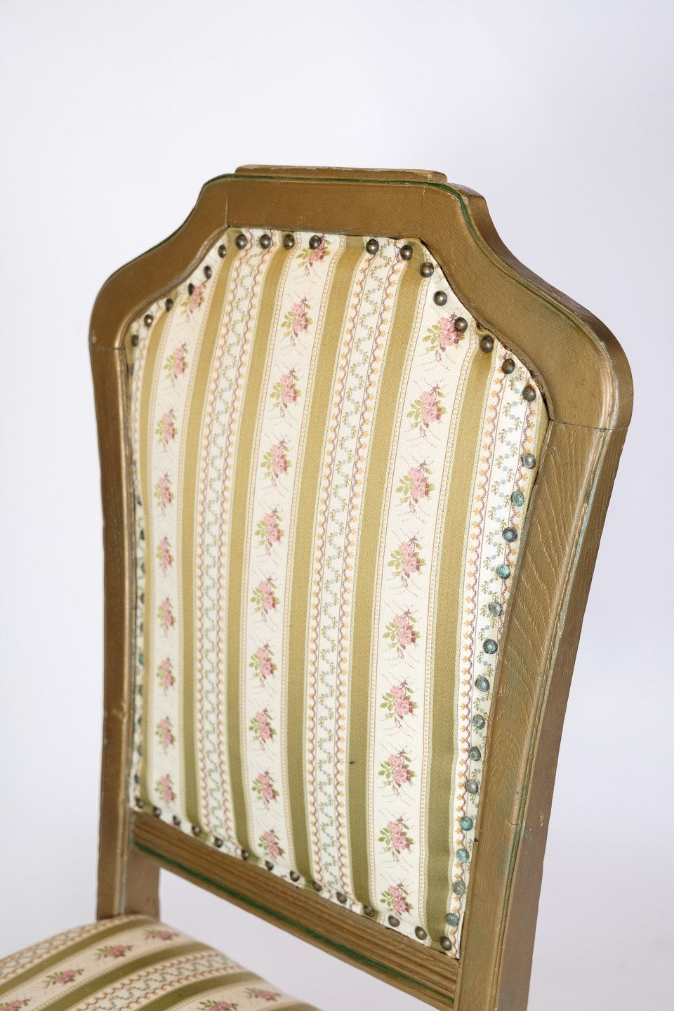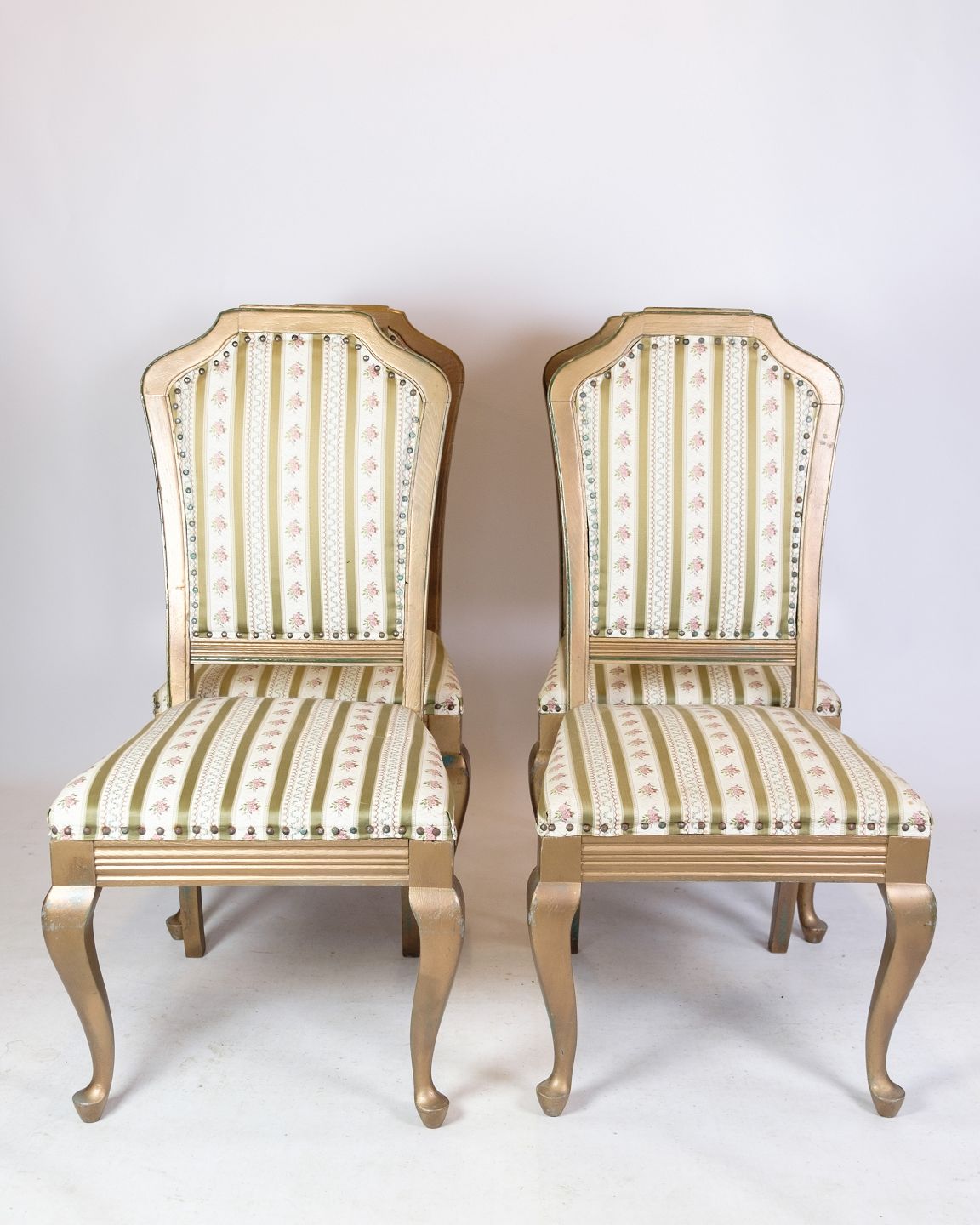 Sæt af fire antikke rococo stole i forgyldt træ med stribet stof fra omkring år 1930'erne.
