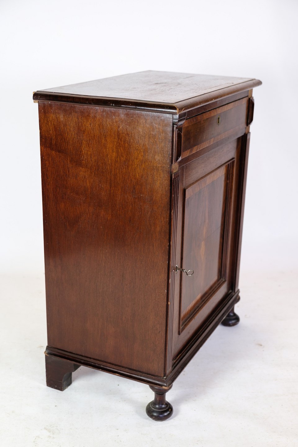Mahogany console with inlaid walnut wood and round legs from around the 1880s.