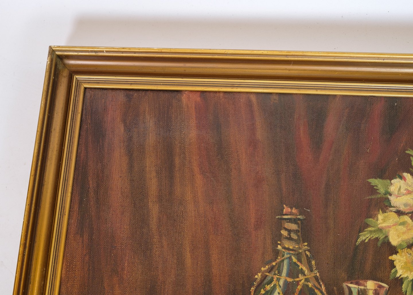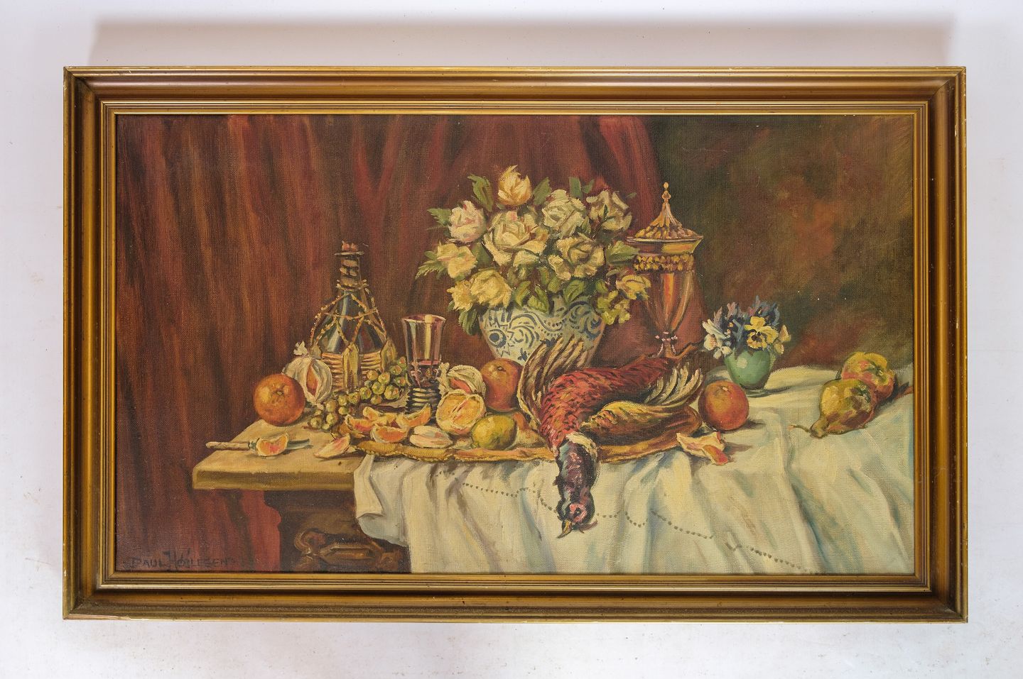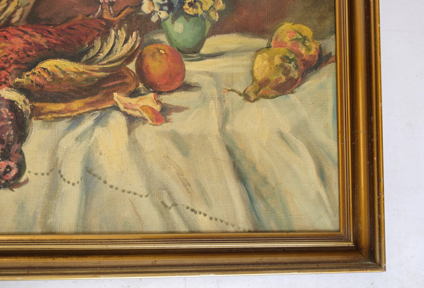SolgtOliemaleri på lærredet med motiv af bordopstilling med frugter og fasan fra omkring 1930'erne.