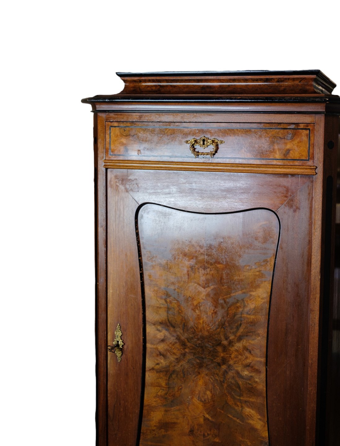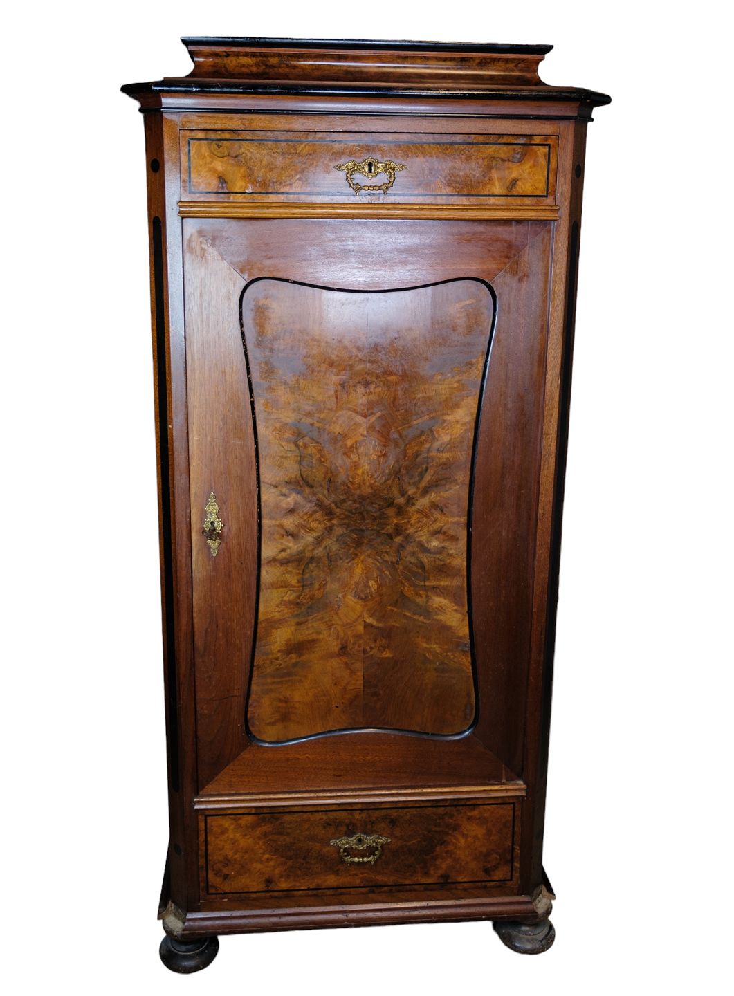 High cabinet of polished walnut, nice antique condition with 2 drawers and a door with shelves from the 1850s