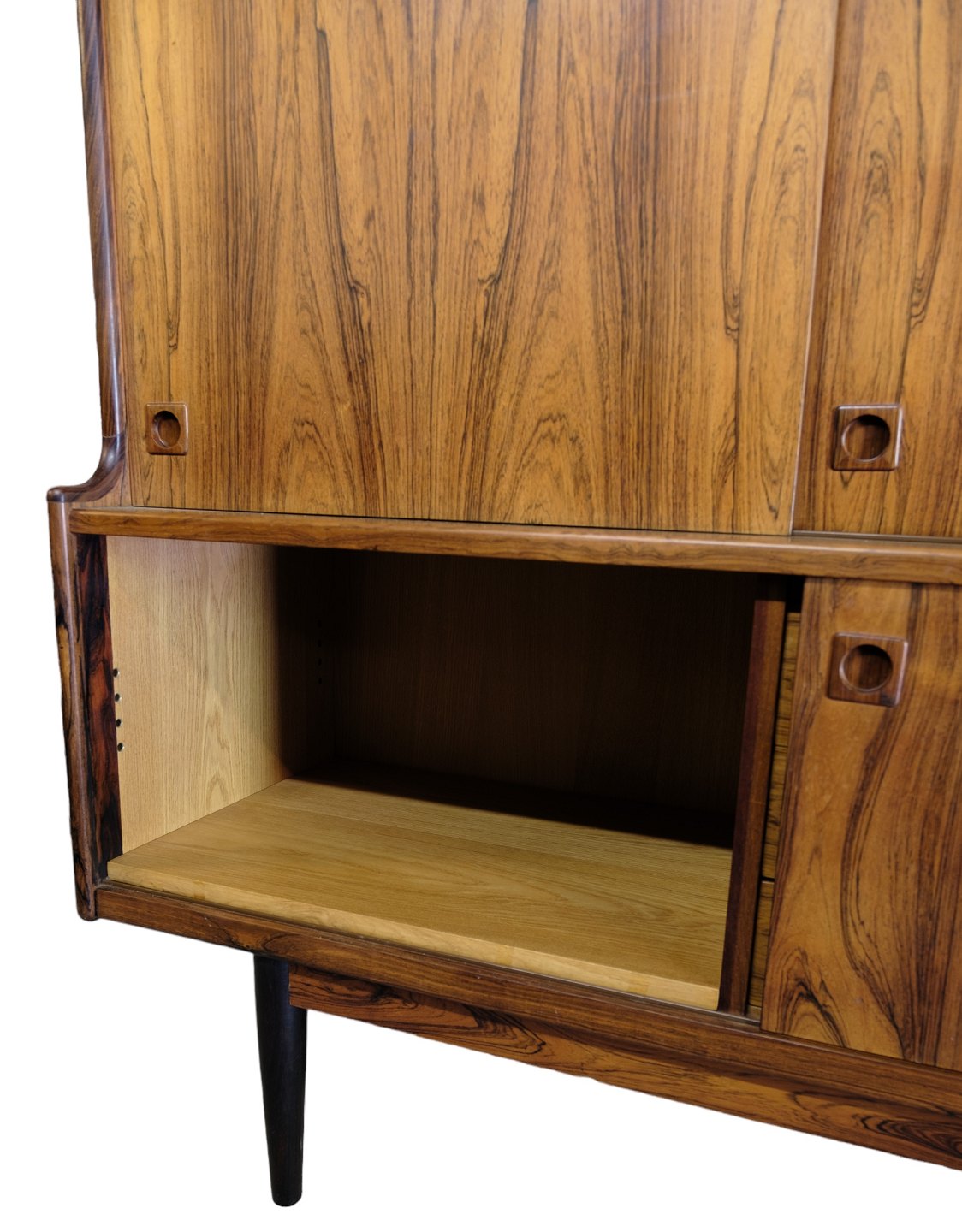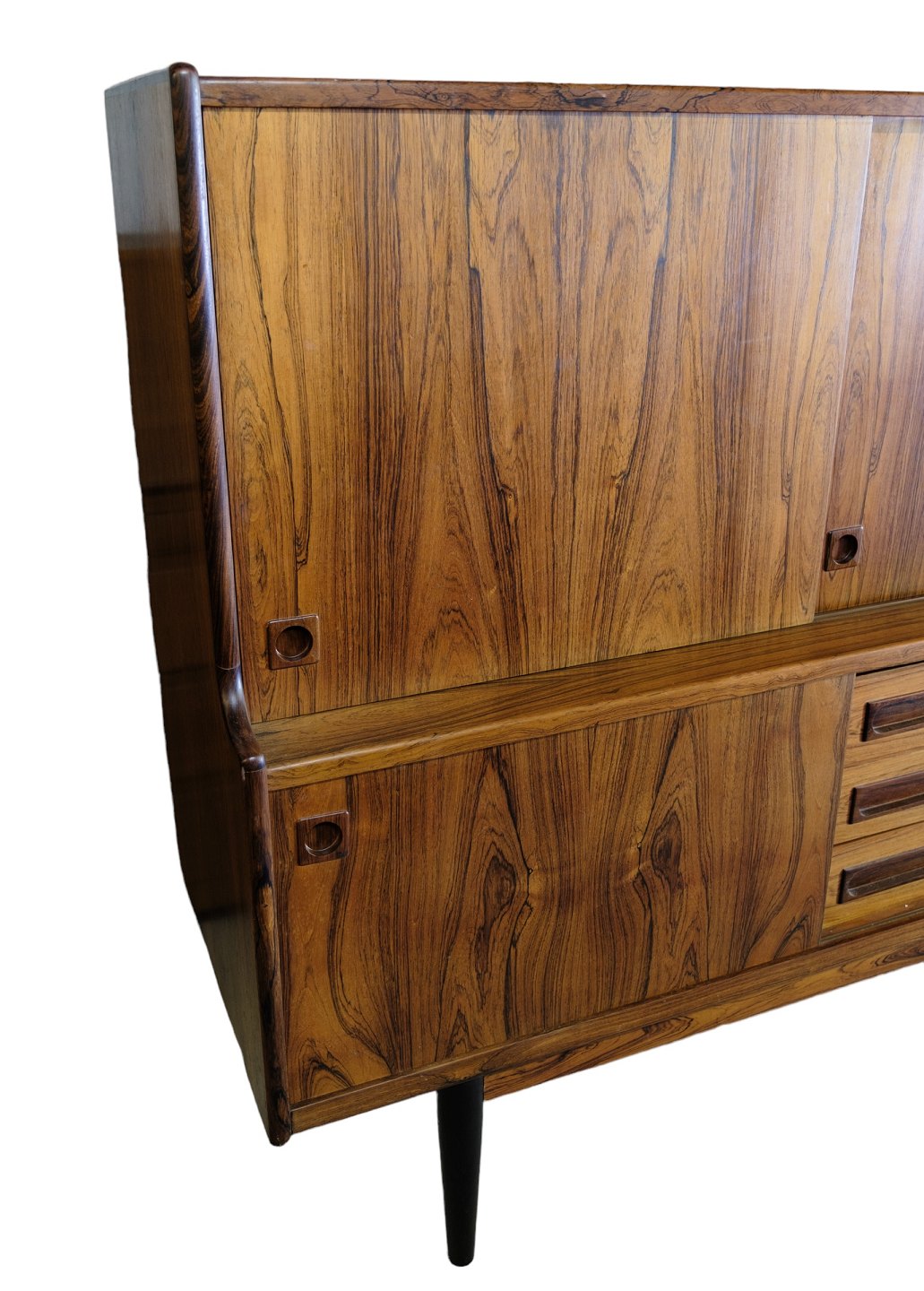 The tall sideboard in rosewood, designed by Johannes Andersen and produced by Skaaning Møbelfabrik around the 1960s, is an impressive example of Danish furniture art from this period.