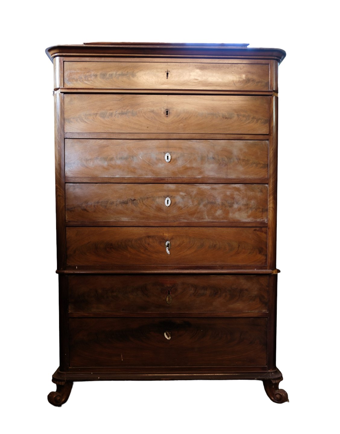 High mahogany chest of drawers with 7 drawers from around the 1840s. Will be inspected at the workshop before possible sale.