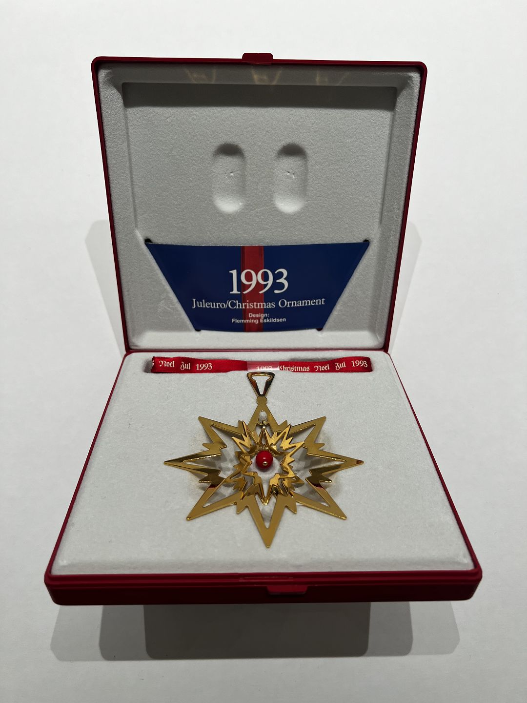 Georg Jensen's Christmas Mobile from 1993 with the title "Christmas Star" is a beautiful piece designed by Flemming Eskildsen. The clock is made of gilded brass and measures 9 cm in height.