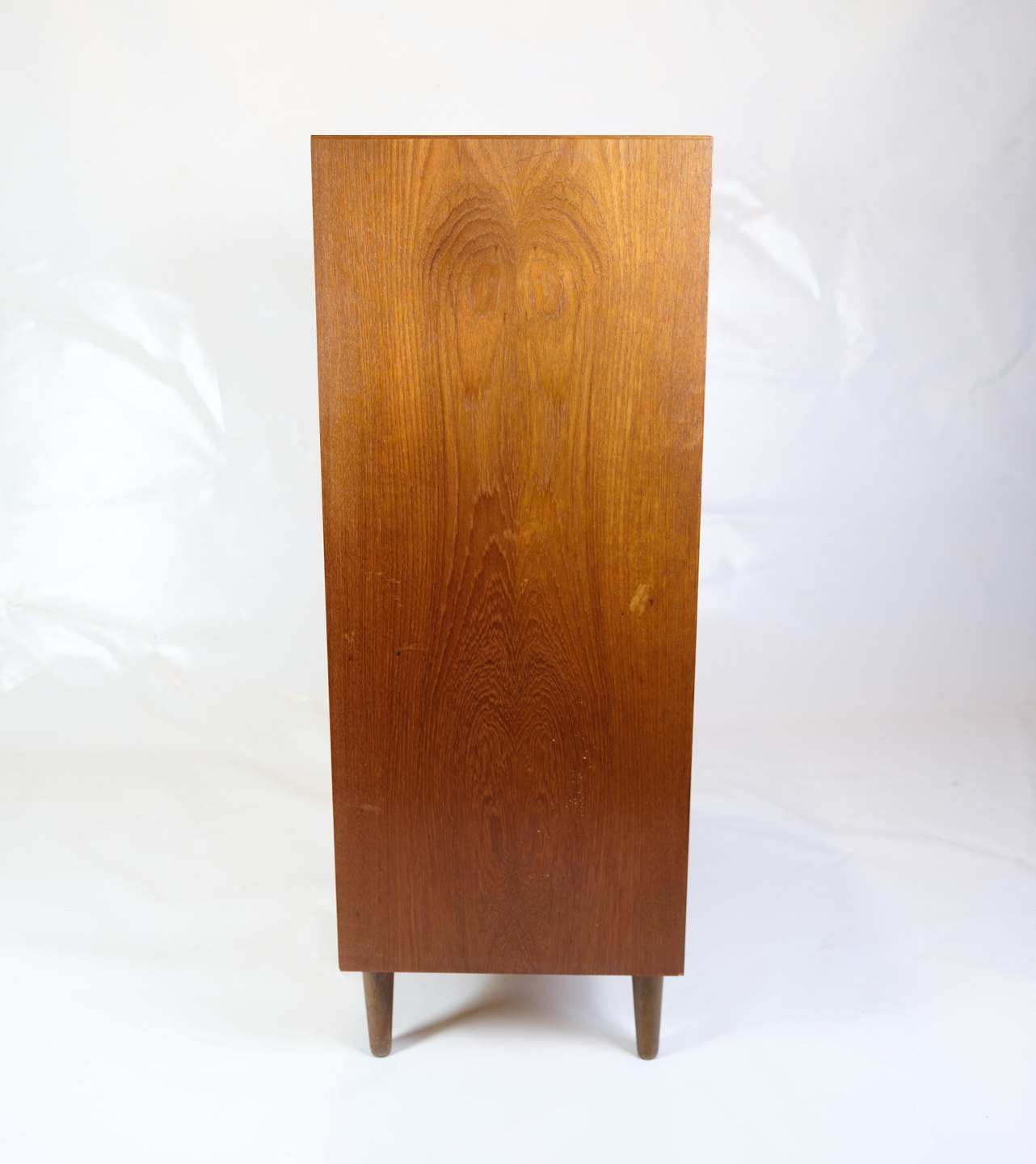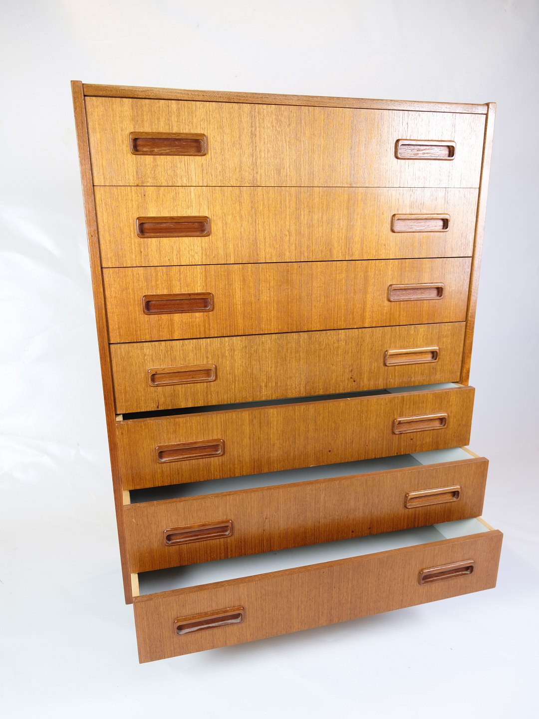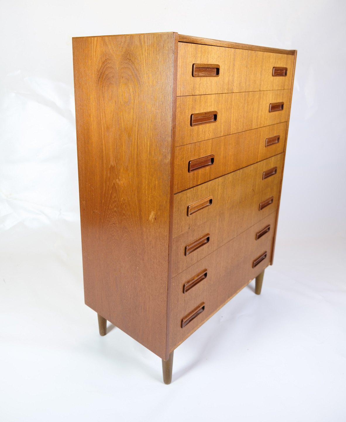 This chest of drawers of Danish design, created around the 1960s, is a beautiful example of the timeless elegance and functionality that characterizes Danish furniture design. Made of teak wood, the chest of drawers exudes a warm and natural beauty that fits perfectly with different interior styles.