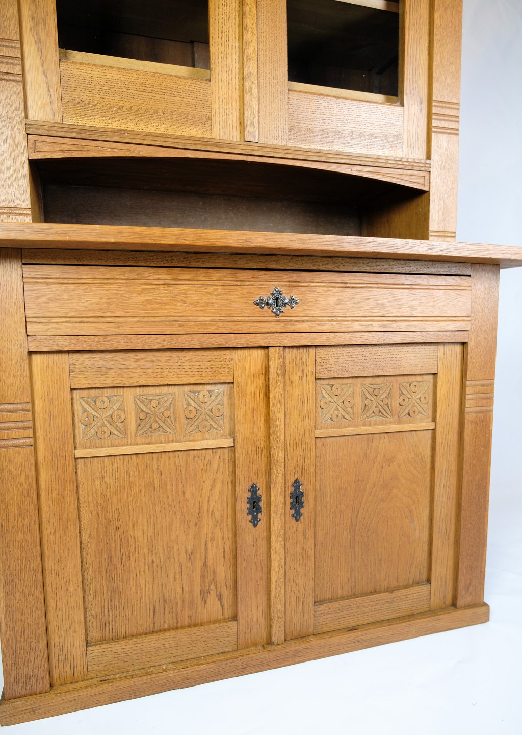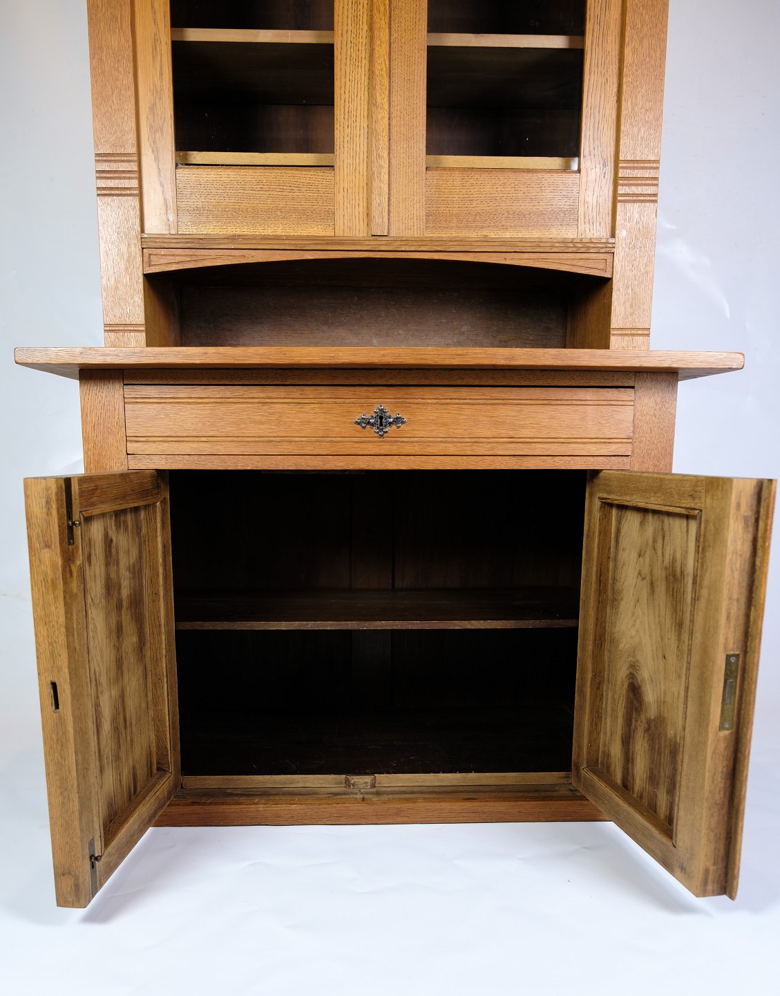 Tall display cabinet made of oak with glass doors and internal shelves with original key from around the 1880s.
