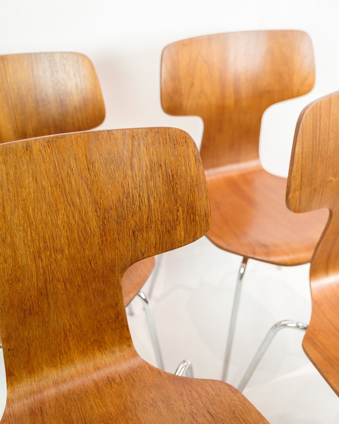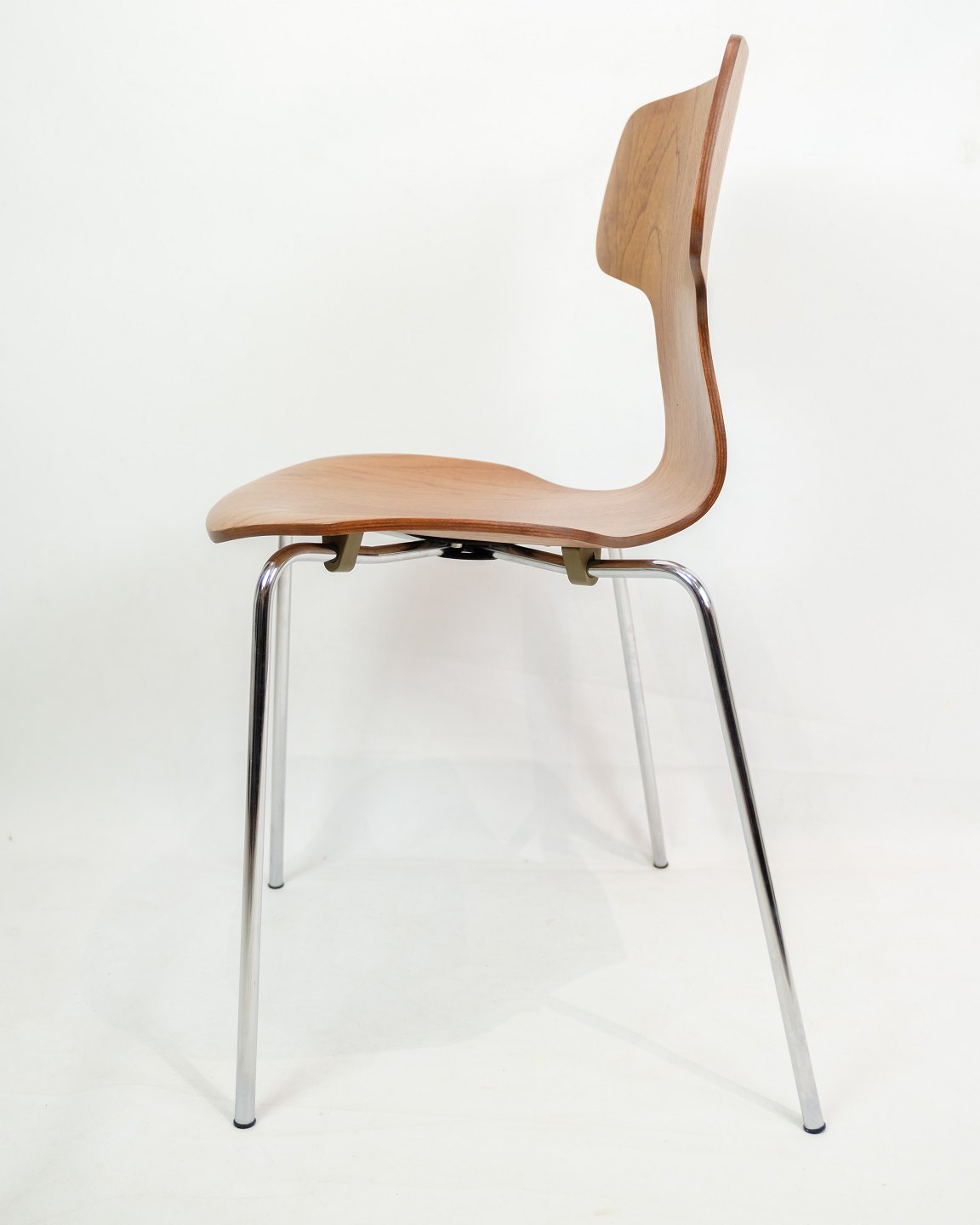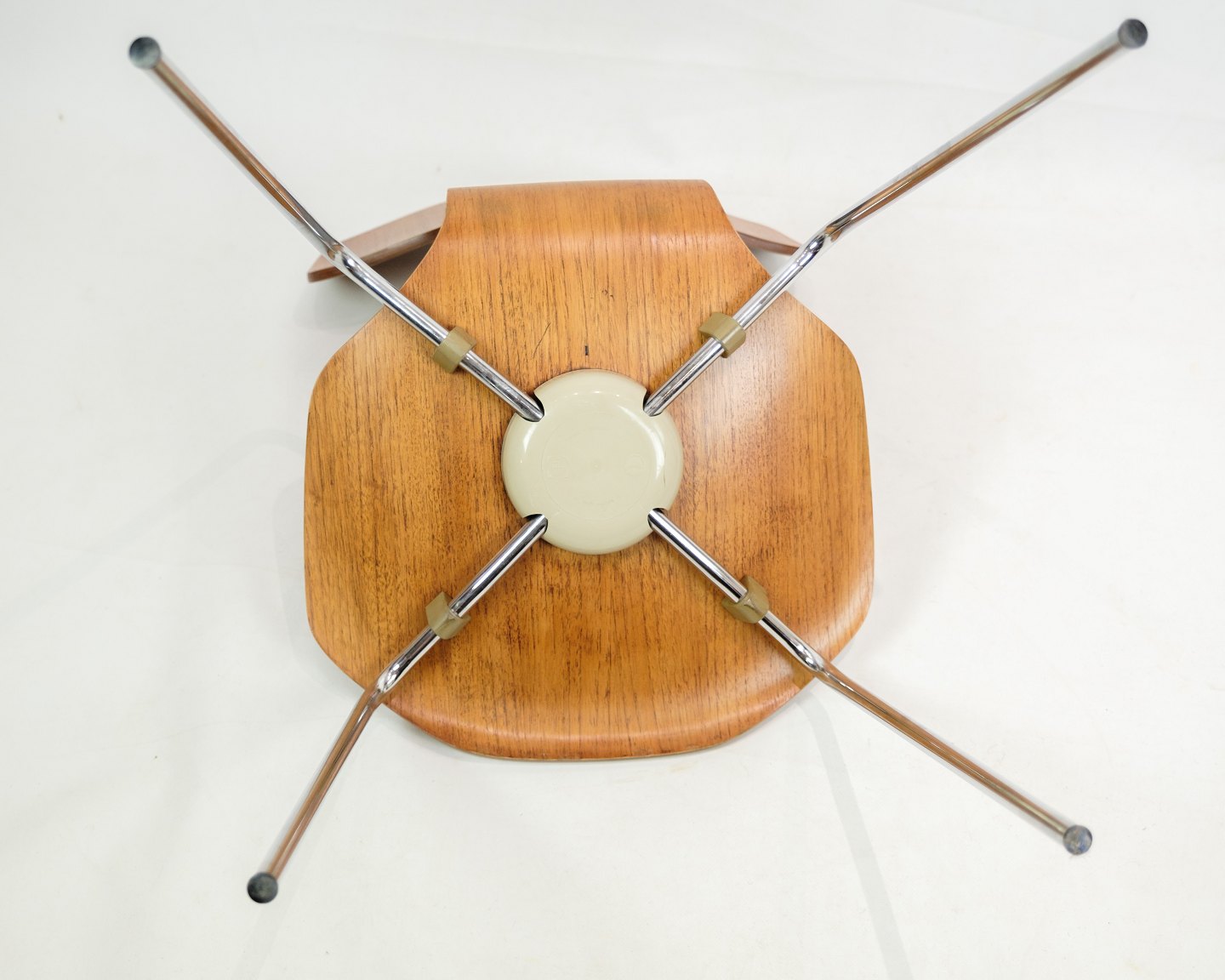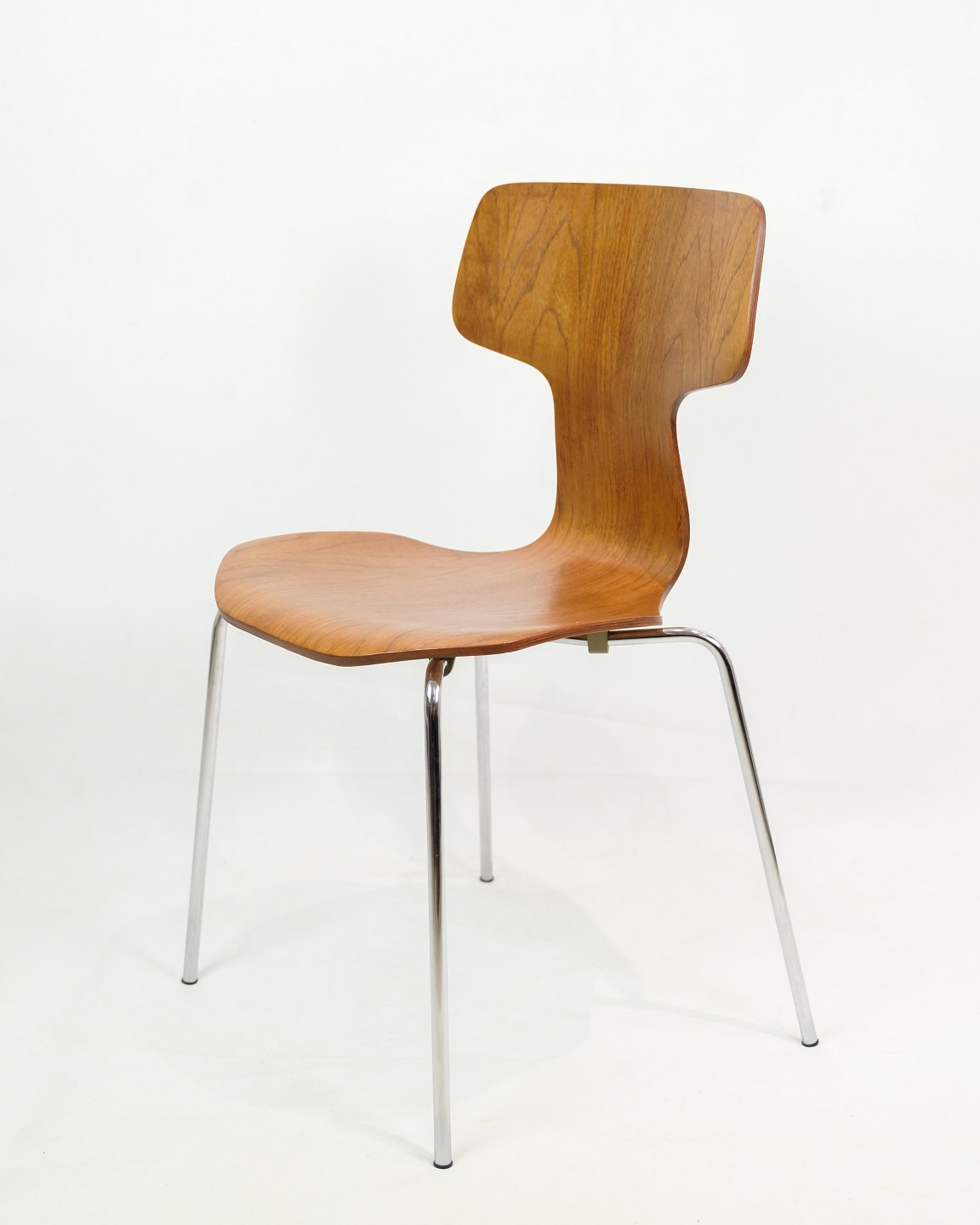 Bring iconic Danish design into your home with the T chair, designed by the legendary Arne Jacobsen and manufactured by Fritz Hansen in the 1960s. This chair, with a chrome frame and teak wood, represents a fusion of functionality and aesthetics, characteristic of Jacobsen's timeless design philosophy.