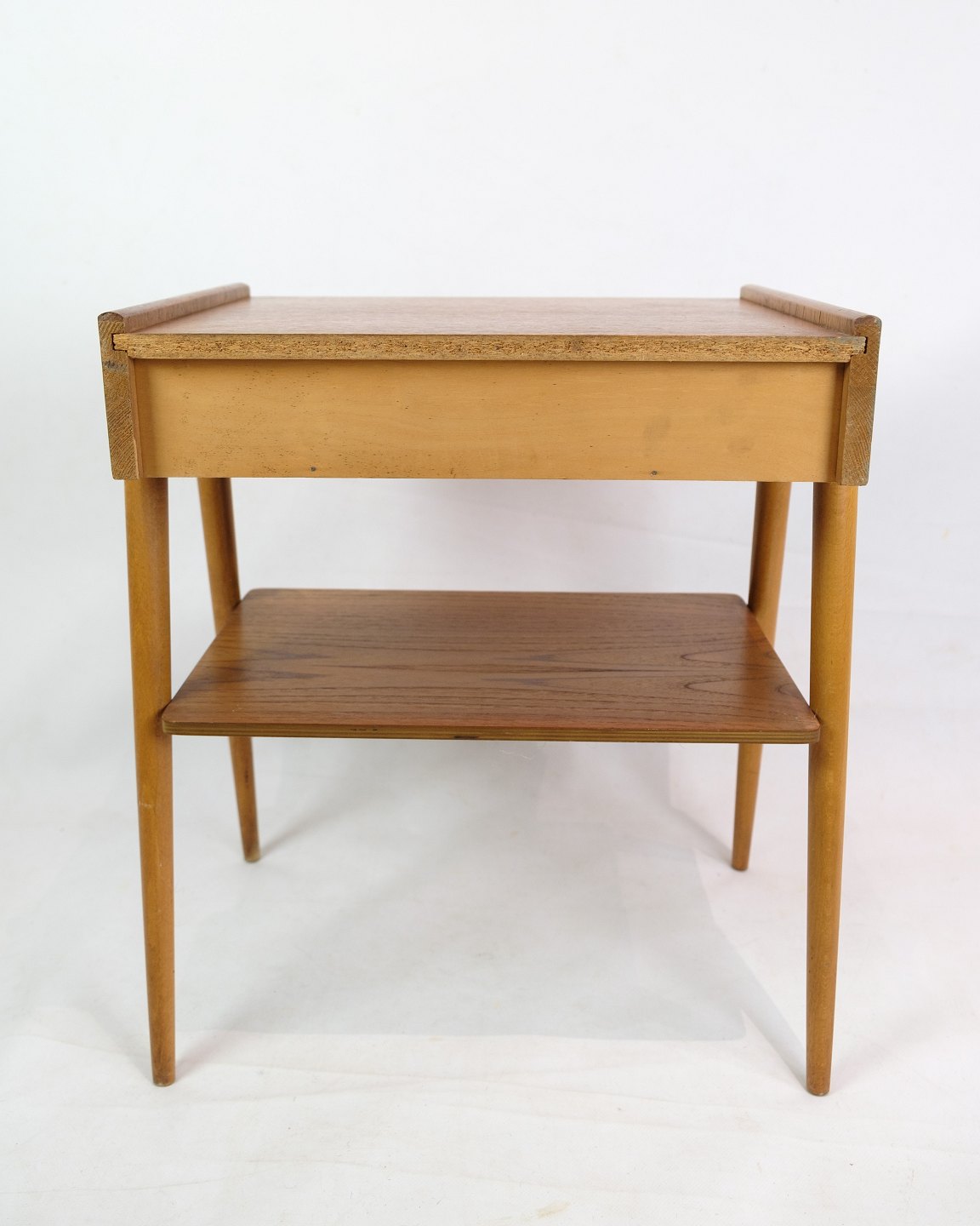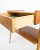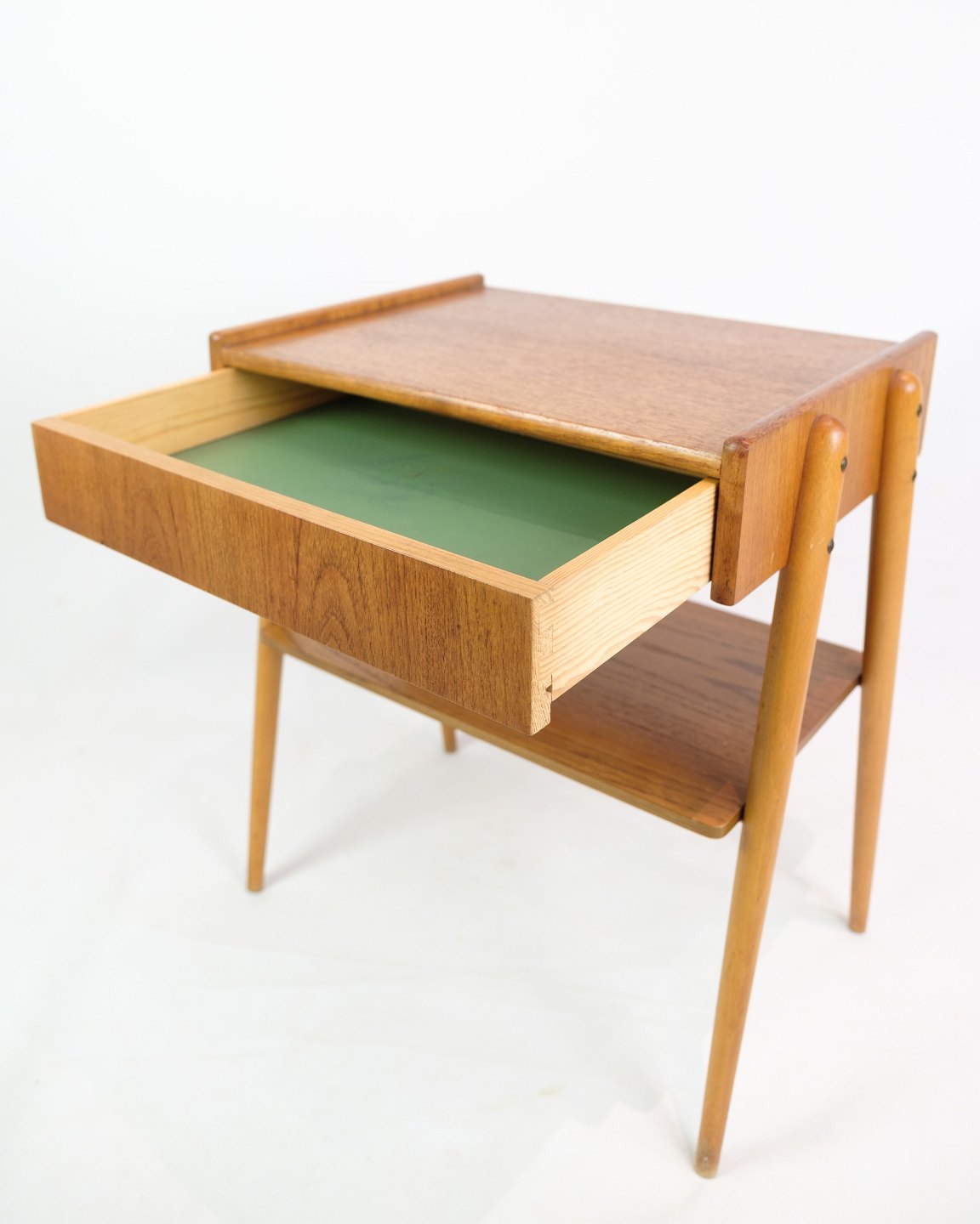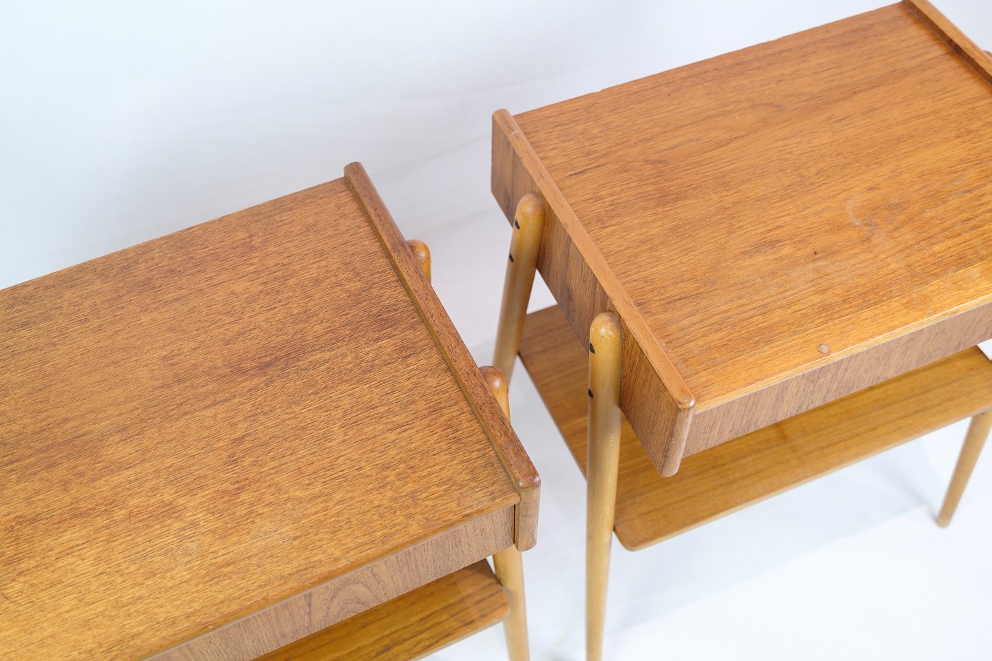 SolgtSæt af natborde på ben med skuffe og hylde, fremstillet af AB Carlström & Co møbelfabrik i Sverige fra 1950'erne. Disse natborde repræsenterer det tidløse og funktionelle design, der kendetegner skandinavisk møbelkunst fra perioden. Benstrukturen giver et let og luftigt udseende, mens skuffen og hylden tilbyder praktisk opbevaringsplads. Producenten, AB Carlström & Co, var kendt for at skabe kvalitetsmøbler.