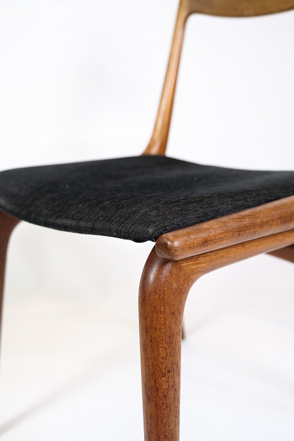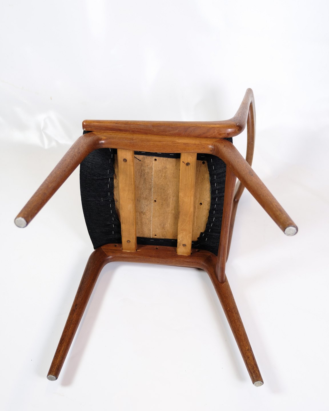 The upholstered seat and backrest in black leather add a luxurious contrast to the teak frame. The leather not only offers a comfortable sitting experience, but it is also known for its durability and ease of maintenance.